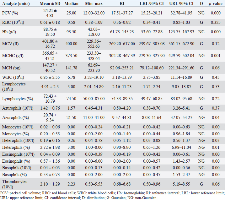 AbstractBackground: The Central American bushmaster (Lachesis stenophrys) is one of the largest pitvipers in the Americas, with relatively low abundance, suspected population declines, and continuing loss, fragmentation, and habitat degradation. Aim: Conservation actions, both in the wild and in captivity, bear the need for health parameters that allow managers and veterinarians to have a better understanding of health, especially when there are relatively few individuals in captivity to obtain robust information since there is no published information on the genus. To have hematological and biochemical reference ranges on the genus Lachesis. Methods: Blood samples were collected from 32 individuals (18 females and 14 males) under human care from 7 zoological institutions from August 2022 to January 2023 and performed hematological and biochemical analyses. Results: Reference intervals of hematological analytes included packed cell volume (17.51%–37.27%), total red blood cell count (0.36–0.92 × 1012/l), hemoglobin (61.73–145.23 g/l), white blood cell count (3.18–13.79 × 109/l), lymphocytes (2.16%–11.23%), azurophils (0.50%–4.20%), monocytes (0.00%–0.21%), heterophils (0.05%–1.12%), eosinophils (0.00%–0.19%), basophils (0.00%–2.00%), and total thrombocyte count (0.68–6.68 × 109/l), and biochemistry reference intervals included total protein (41.76–111.31 g/l), albumin (11.46–28.69 g/l), globulins (29.25–85.14 g/l), aspartate aminotransferase (1.44–68.75 U/l), creatinine kinase (52.72–625.00 U/l), uric acid (20.02–438.53 µmol/l), glucose (0.68–3.29 mml/l), cholesterol (41.74–13.25 mmol/l), calcium (1.78–6.06 mmol/l), and phosphorus (0.72–2.26 mmol/l). Conclusion: This is the first report on the genus Lachesis reporting hematological and biochemical reference ranges. Keywords: Biochemistry, Bushmaster, Costa Rica, Hematology, Lachesis stenophrys. IntroductionThe genus Lachesis has four species, which are the largest pitvipers in the Americas and the only pitvipers that lay eggs (Savage, 2002; Leenders, 2019). This is likely one of the factors that limit their distribution to hot and humid tropical forests since incubation requires a high ambient temperature and a high relative humidity (Leenders, 2019). The Central American bushmaster (Lachesis stenophrys) is one of the longest vipers, with males being slightly longer than females, averaging 2–2.10 and 1.9–2.05 m, respectively (Solórzano, 2004), and frequently over 4 kg in weight (Corrales et al., 2014). It is distributed along the Caribbean versant of Nicaragua to western and central Panama (Campbell and Lamar, 2004), and in Costa Rica, it is found in tropical and subtropical rainforests on the Caribbean versant (Leenders, 2019). The breeding season occurs from February to March. The species is cataloged as Near Threatened (A2c criterion), given the species’ relatively low abundance, suspected population declines, and continuing loss, fragmentation, and habitat degradation, since this species lives in close association with unaltered humid forests (Solórzano, 2004). The rate of decline is likely less than 30% over 10 years or three generations (Acosta-Chaves et al., 2021). On the other hand, this species has public health importance since it may be implicated in ophidic accidents (e.g., snake bites) throughout its distribution, even though other viper species, such as Bothrops asper, are the most frequently involved in accidents (Sasa and Cano, 2020). The size and venom composition make this species very dangerous (Lomonte et al., 2014). This is one of the reasons why it is kept and bred in captivity in institutions in Costa Rica, both for venom extraction and antivenom production. At the same time, it is maintained in some other captive institutions for breeding and conservation programs and exhibitions in Costa Rica and worldwide. Because this is an uncommon species, the captive population is limited to a small number of individuals in the country. Many of these individuals came from the wild since many people in rural areas see the snake as a menace to their family or community, but they prefer to call the local authorities or emergency services before killing a snake (Quesada-Acuña, 2019); therefore, because some individuals cannot be relocated near or have serious injuries, they have to be taken to captive institutions. Other individuals were rescued from illegal traffic since this is a very expensive specimen on the wild animal black market. For reptile collections, blood analyses are necessary for health assessment, entry or exit of collection, baseline determination, presurgical or therapeutic assessment, and diagnosing clinical suspicion of inflammation or organ dysfunction (Heatley and Russel, 2019). Hematology is commonly used to evaluate conditions such as anemia, inflammatory diseases, or parasitemia, while blood chemistry profiles are used to reflect the physiological function and activity of certain organs and physiological status (Nardini et al., 2013; Campbell, 2015). However, reference intervals for total erythrocyte count, hemoglobin, hematocrit, total leukocyte count, and leukocyte differential are difficult to establish for reptiles, mainly due to physiological adaptations that can occur in response to a large number of intrinsic and extrinsic factors. Likewise, studies designed to clarify the relationship between the function of certain organs and changes in chemical values or hematology in reptiles, compared to domestic mammals, are lacking (Campbell, 2015), and most hematology information available for reptiles does not conform to the current American Society for Veterinary Clinical Pathology (ASVCP) guidelines for reference range creation (Heatley and Russel, 2019). For neotropical viperids, there is a lack of information regarding hematology and biochemistry values, both for free-living species and those in captivity (Grego et al., 2006). Conservation actions 