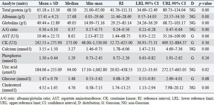 Biochemistry parameters are also similar when compared with some of the investigations mentioned above (Troiano et al., 1999; Grego et al., 2006; Rameh-de-Albuquerque et al., 2007; Silva et al., 2010; Ghilardi and Zacariotti, 2013; Glaser et al., 2013; Gómez et al, 2016; Trujillo et al., 2016; Pereira et al., 2022); however, comparing different biochemistry results done with different equipment may be handled with care, since there can be an important degree of heterogeneity, especially from in-house analyzers (Campbell, 2015). Thus, every clinician must take into consideration the specific methodology because these differences would influence the interpretation of test results and may affect patient management (Campbell, 2015).