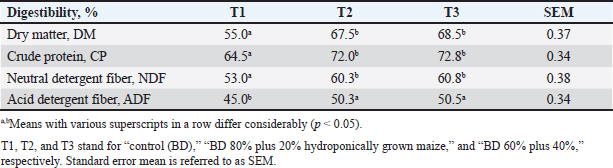 DiscussionThe DM% of HFM was 18.19%, which agrees with the results reported by Naik et al. (2014), who found that calves fed hydroponically grown maize fodder saw a large rise in DCP values and a non-significant increase in TDN values. Additionally, Verma et al. (2015) found that Haryana calves fed hydroponically grown barley fodder experienced a significant (p < 0.05) increase in DCP% and a highly significant (p < 0.01) TDN%. Further, Dadhich et al. (2019) observed that hydroponic maize fodder had a significant (p < 0.01) impact on the percentages of DCP% and TDN% in Rathi calves. Also, Naik et al. (2014) found that partial replacing hydroponic maize fodder with maize grain of concentrate mixture enhanced dry matter intake per 100 kg body weight. Farghaly et al. (2019) indicated that hydroponic barley fed to sheep improved dry matter intake. Additionally, Dadhich et al. (2019) observed that hydroponic maize fodder had a significant (p < 0.01) impact on the percentages of DCP% and TDN% in Rathi calves. Helal (2015) noted that the TDN g kg−1 BW and DCP% enhanced significantly (p < 0.05) using sprouted barley grain in goats. Table 7. The effects of feeding hydroponically grown maize on the nutrient digestibility of buffalo calves.