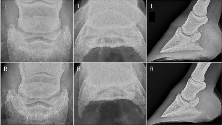 Fig. 2. Preoperative radiographs of the digits of horse 2. Horse 2 remained comfortable postoperatively with no appreciable lameness until approximately day 129, at which time a mild and inconsistent grade 4/5 RF lameness was noted. On day 136 post-PDN, the gelding was presented for student teaching of radiographic techniques. Radiographs were taken of both front digits, which revealed a parasagittal fracture of the right forelimb navicular bone and mild hyperextension of the right DIPJ (Fig. 4). Ultrasound revealed severe fiber pattern disruption of the DDF tendon suggestive of severe tendinopathy or rupture in the distal pastern region of both the right and left forelimbs. Humane euthanasia was elected due to the severity of the pathology and poor prognosis. Postmortem MRI was performed on both forelimbs revealing marked bilateral navicular bone degeneration with an obliquely oriented complete fracture of the lateral quarter of the navicular bone on the right forelimb, and bilateral severe DDF tendinopathy with almost complete rupture of the DDF tendon at the level of the navicular bone (Fig. 4). Additional findings of note in both forelimbs were significant navicular bursitis with probable bursal adhesions, enthesopathy of the flexor surface of the third phalanx at the DDF tendon insertion site, and impar, collateral sesamoidean ligament, and distal digital annular ligament desmopathy. DiscussionBoth cases described here report the occurrence of navicular bone fracture, DDF tendinopathy, and DIPJ subluxation after PDN in horses restricted to pasture turnout with no forced exercise. While these complications of PDN are well known, to the best of authors’ knowledge, they have not been reported specifically in horses not in work. PDN is typically performed to achieve soundness for some degree of athletic activity, creating a significant risk for catastrophic injury following surgery in a horse with structural unsoundness related to severe navicular bone degeneration and/or soft tissue injury. A search of the current literature identified only one case report of DDF tendon rupture and bilateral subluxation of the DIPJs after PDN; at the time of DDF tendon rupture, the horse was 8 weeks post PDN and it was not specified whether or not the horse had yet returned to work (Rose, 1977). The fact that both horses discussed here sustained such substantial complications of PDN while not in any kind of forced exercise program suggests that even the mechanical forces experienced from normal daily activity may predispose horses with significant pathology to catastrophic injury following PDN. This calls into question the rationale for performing PDN as a salvage procedure for horses with severe pathology. Candidates for PDN should be evaluated thoroughly to ensure appropriate case selection. In addition to navicular bone pathology, horses with navicular syndrome often have identifiable lesions of the DDF tendon and other soft tissue structures of the navicular apparatus. Specifically, there is a positive correlation between navicular bone abnormalities and concurrent DDF tendinopathy (Dyson et al., 2003, 2005; Blunden et al., 2006; Dyson and Murray, 2007; Dyson et al., 2011; Dyson, 2015). Severe, persistent lameness that improves following palmar digital anesthesia in the absence of radiographic evidence of navicular bone degeneration can be suggestive of soft tissue injury within the navicular apparatus including but not limited to the DDF tendon. MRI remains the gold standard for identifying musculoskeletal pathology of the distal limb (Dyson et al., 2003, 2005; Zubrod and Barrett, 2007; Blunden et al., 2009; Maher et al., 2011; Acutt et al., 2022). Unfortunately, the availability of MRI is sometimes limited, or MRI may not be financially feasible for some clients. Although technically challenging, the DDF tendon can be imaged with ultrasound as far distally as the proximal border of the navicular bone (Acutt et al., 2022); however, only 10%–28% of DDF tendinopathy lesions diagnosed with MRI were identified by ultrasound (Whitcomb, 2005, 2008; Acutt et al., 2022). Horses with core or linear lesions of the DDF tendon have been suggested to be poor candidates for PDN, as they have been shown to experience residual or early recurrent lameness postoperatively (Gutierrez-Nibeyro et al., 2015). DDF tendinopathy was a concern in both of the horses in the current report specifically due to the mineral opacities in the area of the DDF tendon noted on preoperative radiographs. Advanced imaging, such as MRI, was not obtained in either of these cases preoperatively due to a lack of availability and recognition that the PDN procedure was being performed to salvage the horses for pasture soundness only.