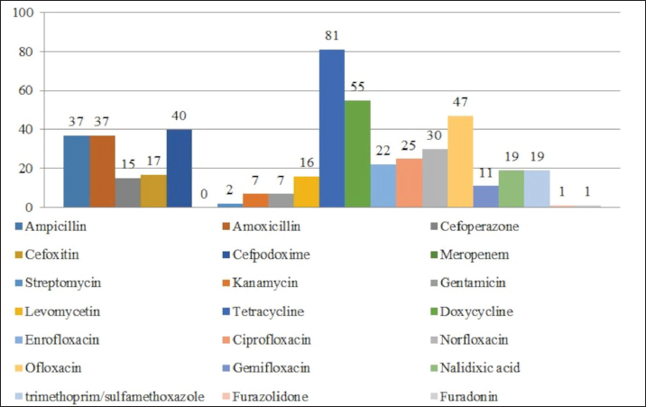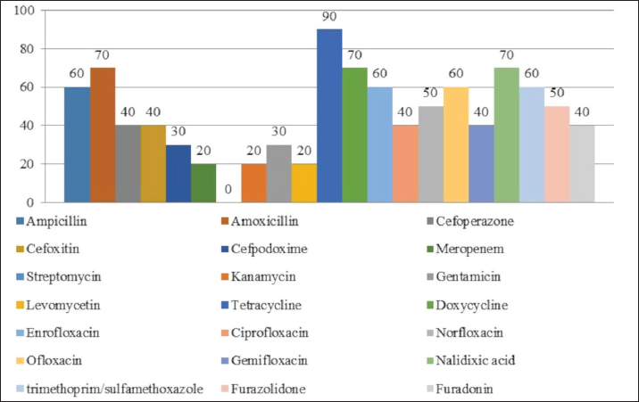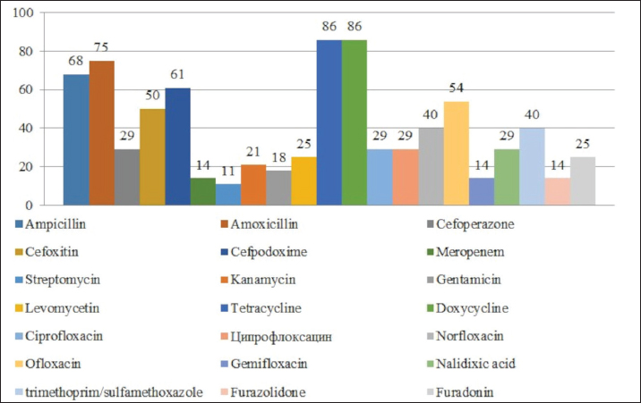 Fig. 1. Antibiotic resistance of E. coli isolates (%). Of the 28 Klebsiella strains examined, 86% (24 strains) of the microorganisms were resistant to tetracycline and doxycycline, 75% (21 strains) to amoxicillin, 68% (19 strains) to ampicillin, to cefpodoxime 61% (17 strains), to ofloxacin 54% (15 strains), to cefoxitin 50% (14 strains), to norfloxacin and trimethoprim 40% each (11 strains), to nalidixic acid cefoperazone enrofloxacin and ciprofloxacin 29% (eight strains each), to levomycetin and furadonine 25% (seven strains each) of microorganisms, to kanamycin 21% (six strains), to gentamicin 18% (five strains), to meropenem, gemifloxacin and furazolidone, 14% each (four strains), and the lowest number of organisms were resistant to streptomycin, 11% (three strains) (Fig. 2). Antibiotic resistance testing of 10 Citrobacter isolates resulted in all microorganisms being 90% resistant to tetracycline, amoxicillin, doxycycline, and nalidixic acid was resistant to 70% of the microorganisms, ampicillin, enrofloxacin Ofloxacin trimethoprim 60% of strains, norfloxacin, furazolidone 50%, cefoperazone, cefoxitin, ciprofloxacin, gemifloxacin, and furodonin 40% each, cefpodoxime and gentamicin 30%, meropenem, kanamycin and levomycetine 20% of organisms. No streptomycin-resistant strains were identified (Fig. 3). Of the 11 Enterobacter strains isolated, the microorganisms demonstrated 100% resistance to ampicillin, 91% to amoxicillin, 64% to doxycycline, 55% to tetracycline, and furadonine, 36% for cefoxitin, cefpodoxime, ofloxacin, 27% for ciprofloxacin and trimethoprim, 18% for cefoperazone, norfloxacin, and furazolidone, and 9% for kanamycin and nalidixic acid. Meropenem, streptomycin, gentamicin, levomycetin, enrofloxacin, and gemifloxacin were not identified as resistant to the isolates of Enterobacteriaceae (Fig. 4). A study of 12 microorganisms of the genus Proteus for antibiotic resistance demonstrated that 100% of the isolates were resistant to tetracycline and furazolidone; 92% of isolates were resistant to doxycycline, 83% of microorganisms were resistant to furadonine, 67% of isolates were resistant to trimethoprim, 50% of isolates were resistant to levomycetin, enrofloxacin, and ofloxacin, 42% of microorganisms were resistant to amoxicillin and norfloxacin, to ampicillin, cefpodoxime, gentamicin, gemifloxacin, and nalidixic acid 33%, to cefoperazone, kanamycin, enrofloxacin 25%, 17% were resistant to cefoxitin. The strains demonstrated the least resistance (8%) to meropenem and streptomycin (Fig. 5). The final stage of the work was to perform research to determine the resistance genes of the organisms. The results of these studies, using the polymerase chain reaction technique, from 149 samples of E. coli DNA (deoxyribonucleic acid), 46 samples were obtained that have genes encoding resistance to beta-lactase antibiotics (BlaTEM—26, OXA—20), aminoglycosides—62 (StrA—29, StrB—31, aadB—2), tetracyclines—44 (tetA—32 and tetB—12), sulfonamides—15 (SUL1—9, SUL3—6), fluoroquinolones—3 (qepA—2, qnr—1).