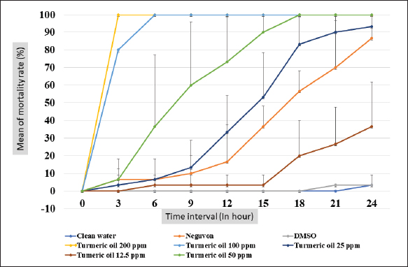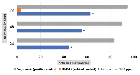 Fig. 4. In vivo mortality of Argulus spp. treated with 12.5 ppm of turmeric oil compared to positive and negative controls (* indicate significance at p < 0.05). This research also determined the antiparasitic efficacy of the extracted oil against fish lice in goldfish. We discovered turmeric oil had the ability to fight organisms. In vitro studies found a relationship between the concentration of turmeric oil and the mortality rate of Argulus spp. The increasing concentration has shown a rising mortality rate for parasites. At 200 mg l−1, essential oil performed the h ighest anti-parasitic activity. However, an in vivo test revealed that 12.5 mg l−1 of the testing solution was a suitable dose to treat infested animals without toxic effects. These results were in agreement with the study of the insecticidal and repellent efficacy of extracted oil from turmeric rhizome used against insect pests, as well as Tavares et al. (2013), who detected high percentages of ar-turmerone in nonpolar extracts and essential oils that presented anti-repellent activity to Sitophilus zeamais and Spodoptera frugiperda (Tavares et al., 2013), 50% and 100% of S. zeamais were killed by 0.1% of the active substance in 15 days and by 1% of ar-turmerone in 7 days, respectively. Moreover, in the case of S. frugiperda, they reported that 1% of the active compound eliminated 58.3% of S. frugiperda and reduced the development of this insect (Tavares et al., 2013). However, in the present study, to ascertain the acute toxicity in the fish model, which was evaluated by only monitoring the behaviors and responses of the animals, further experimentation and analysis of the biochemical and histopathological data should be done to understand the mechanism of the acute toxicity of turmeric oil (Ramesha et al., 2016; Bhartia and Rasool, 2021). During our investigation, we observed that fish infested with Argulus and exposed to a 2% DMSO solution, which served as the vehicle control for the in vivo test, did not exhibit parasite mortality within the first 72 hours. However, we did observe a mortality rate among the fish parasites after the 72-hour point. This finding was caused by the fact that Argulus spp. could not complete its lifecycle in the absence of a host (Steckler and Yanong, 2012; Thakur et al., 2022); the use of 2% DMSO had no effect on this result. Furthermore, when Intirach et al. (2012) investigated the larvicidal effects of turmeric oil against Anopheles cracens, they noticed that 100 mg l−1 of the extracted oil demonstrated promising efficacy with 100% larval mortality (Intirach et al., 2012). In addition, the results of the investigation indicated that the duration to eliminate fish lice in the in vitro test was less than in the in vivo test. The difference between in vitro and in vivo tests could be described by the treatment in the in vitro experiment: the Argulus were separated from the host with no protection, so the organisms were directly contacted with a chemical solution. However, under in vivo conditions, the essential oil was obstructed from approaching parasites by the scales and fins of the host, and the covered mucous on the fish body and lice, produced by the immune response of the fish, might also interfere with the contact between Argulus spp. and chemical reagent (Mitsuwan et al., 2020). On the other hand, the mechanism of antiparasitic activity of turmerone oil was not clarified, but it could be explained by Blenau et al. (2012), who reported antiparasitic mechanism action of volatile substances from herbal plants presented through inhibited and stimulated various substances and receptors such as octamine, tyramine, acetylcholine, and Gamma-aminobutyric acid (Blenau et al., 2012). In addition, the toxicity effect of essential oil in our study might be justified by the research of Kostyukovsky et al. (2002). High concentrations of essential oil from medical plants performed insecticidal and repellent activity by inhibiting the acetylcholinesterase enzyme but also could eliminate insects and vertebrate hosts, likely through organophosphates such as Neguvon® (Kostyukovsky et al., 2002). Due to this, it was important to acquire an appropriate dose of turmeric essential oil to fight against fish lice. Argulus spp. infesting fish caused an increase in diseased animals and a rise in the mortality rate of hosts, which was a serious problem and led to economic loss. The efficacy of antiparasitic treatment and acute toxicity using turmeric essential oil to cure diseased fish was confirmed by this present study. The primary active compounds in the extracted oil were also discovered. These might encourage the use of natural substances as an alternative way for the control and treatment of disease in aquaculture that have safety, low adverse effects, are decomposable, and have eco-friendly properties. Drug resistance from the overuse of hazardous chemicals, which is a serious global problem, might be solved. ConclusionAntiparasitic activity in numerous traditional medicinal plants has been investigated. However, the efficacy of turmeric essential oil against Argulus spp. infected fish is infrequently studied. Our research demonstrates that turmeric oil has a high potential for eradicating Argulus spp. Thus, the essential oil extracted from this plant can be used as an alternative treatment to the traditional chemicals that were responsible for a variety of ecological and health issues, such as persistent hazards in the environment, adverse effects on animal and human health, and a particular resistance to medications and chemicals. Further research is required to determine the mechanisms of action underlying the antiparasitic and toxic effects of turmeric oil’s active ingredients. In addition, a pharmaceutical preparation of turmeric oil could be created that is simple to use in fish aquaculture and has a precise dosage. AcknowledgmentsThe authors are thankful to the Faculty of Veterinary Medici