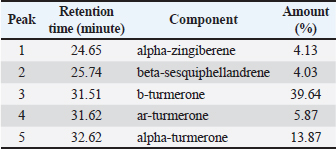 Fig. 1. Feature of a fish parasite in goldfish under stereoscopic microscopy. (A) Lived organism with mobility. (B) No movement of dead organisms with incomplete physical appearance (arrows). Ethical approvalThe Animal Care and Committee of the Faculty of Veterinary Medicine, Chiang Mai University (FVM-ACUC) (Process number: R17/2557), approved the investigation for use in animal studies. ResultsPlant material and chemical analysis of the essential oilThe extraction yield was 0.7% of the weight of the raw turmeric rhizome. Observed against a white background, turmeric essential oil possessed a fluid consistency and a pale yellow color. In addition, the extracted oil was liquid at ambient temperature. The GC-MS study found that the extracted essential oil of turmeric had a wide range of chemical components. A comprehensive number of components were identified in the extracted oil. The GC-MS chromatogram presented in Figure 2 exhibits a substantial number of peaks, each characterized by distinct chemical constituents. The extracted essential oil contained b-turmerone (39.64%) and alpha-turmerone (13.87%) as the primary chemical components, as indicated in Table 1. In addition, the compounds ar-turmerone, alpha-zingiberene, and beta-sesquiphellandrene were identified, with respective concentrations of 5.87%, 4.13%, and 4.03%. In vitro testThe results of effectiveness testing of different concentrations of turmeric oil, which were 12.5, 25, 50, 100, and 200 ppm, and control vehicles against the Argulus spp. parasite are presented in Figure 3. In the in vitro test, 200 pp m of turmeric oil performed the highest antiparasitic activity of up to 100% and killed Argulus spp. in 180 minutes. Furthermore, 50 and 100 ppm of essential oil revealed an antiparasitic efficacy of up to 100% and killed in 1,080 and 360 minutes, respectively. However, during observation time, the mean mortality rate (%) in the 12.5 and 25 ppm turmeric oil groups was 36.66 ± 25.16 and 93.33 ± 5.77, respectively. In addition, the antiparasitic efficacy of Neguvon® (the positive control) group showed 86.66 ± 23.09 in 1,440 minutes. Finally, after 24 hours, the results of the clean water group and the DMSO group were 3.33 ± 5.57. In vivo testThe toxicity of turmeric essential oil was determined at 12.5, 25, 50, 100, and 200 ppm. We found the safe dose of the working solution to be 12.5 ppm. At this concentration, there was a significantly higher antiparasitic effect than in the negative control and the vehicle control (p < 0.05). Thus, this concentration was selected to apply in the next experiment. In vivo antiparasitic efficac y testing demonstrated on infected fish that soaking with 12.5 ppm of turmeric essential oil, dimethyl sulfoxide, and Neguvon® resulted in the results shown in Figure 4. During the observation period, the Neguvon® group achieved the highest percentage decrease in Argulus spp. infection in treatment, 94.69 + 0.003. However, 12.5 ppm of essential oil presented 62.83 ± 0.004 of antiparasitic efficacy (%). DiscussionCurcuma longa L., commonly known as turmeric, was native to tropical South Asia but is now generally harvested in tropical regions of the world. It was botanically related to the Zingiberaceae family (Kim et al., 2013; Setyaningsih et al., 2019; Mitsuwan et al., 2020; Kumar et al., 2022). The role of essential oil from the rhizome of turmeric performed various pharmacological properties in terms of antibacterial, antiviral, and antiparasitic activities for treating disease in humans and animals (Méndez et al., 2016; Martinez-Correa et al., 2017; Singh et al., 2017; Sornpet et al., 2017). The percentage yield in essential oil extraction in this study was 0.7% of the weight of fresh turmeric rhizome. Similarly, some studies in India have reported that C. longa L. essential oil in fresh rhizomes yields between 0.37% and 0.8% in different agroclimatic zones (Sandeep et al., 2016), and between 0.61% and 1.45% in the northern part of the country (Garg et al., 1999). Furthermore, Pino et al. (2018), who studied in Amazonian Ecuador, revealed the percentage yield of essential oil in fresh rhizomes was 0.8%. On the other hand, the percentage yield of essential oil that was extracted from dry turmeric rhizome in the USA varied from 1.5% to 5.0% (Li et al., 2011). Moreover, the researchers in Brazil reported a percentage yield of essential oil from dry rhizomes between 3.0% and 5.16% (Guimarães et al., 2020). To date, the chemical compositions in turmeric oil have been investigated and generally contain primarily phenolic compounds and terpenoids, including diarylheptanoids (including those commonly known as curcuminoids), monoterpenes, sesquiterpenes, diterpenes, triterpenoids, alkaloids, and sterols. This present research detected turmerone (59.38%) as the major compound in the extracted oil from fresh rhizomes. Our results were in agreement with previous studies by Pino et al. (2018), who reported that turmerone (58.9%) was the most represented class of volatiles from rhizomes grown in Amazonian Ecuador, including ar-turmerone (45.5%) and alpha-turmerone (13.4%). Similar results were performed by Jaiswal and Naik (2021), Guimarães et al. (2020), Intirach et al. (2012), and Devkota and Rajbhandari (2016), whose data indicated that 58%, 50.05%, 49.21%, and 25.93% of turmerone were revealed as the major constituents, respectively. Nevertheless, the previous research presented the other compounds as the major components in the essential oil, including from fresh rhizomes in Brazil (11% zingiberene) (Gonçalves et al., 2019), from plants cultivated in Korea (27.70%–36.75% alpha-zingiberene) (Hwang et al., 2016), from raw materials grown in Sri Lanka (18.2% alpha-phellandrene) (Herath et al., 2017), and from herbs in Nigeria (13.9% beta-bisabolene) (Usman et al., 2009). In numerous previous studies presented, several factors could interfere with the percentage yield of essential oils and the che