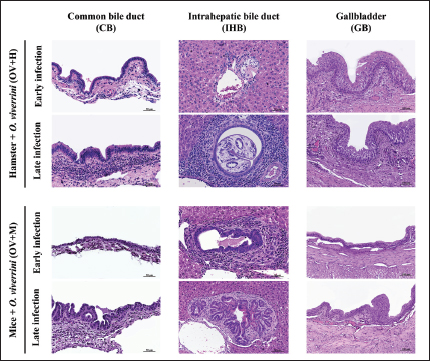 Fig. 1. In the location study, the experimental design encompassed the infection of two different animal species. Subsequently, these animals underwent sacrifice, and sample collection was conducted at specific time intervals: 1, 2, 7, 14, 28, and 56 days. The experimental groups were designated as follows: OV+M (BALB/c mice with O. viverrini infection), and OV+H (Syrian golden hamsters subjected to O. viverrini infection). Statistical analysisStatistical analysis in this study was conducted using SPSS version 23.0. To compare the mean values between different groups, a One-way ANOVA with Fisher’s Least significant difference post hoc test was employed. A p-value of less than 0.05 was considered statistically significant. Ethical approvalThe study protocol was subjected to review and approved by the Animal Ethics Committee of Khon Kaen University approved the study protocol (IACUC-KKU 78/2561). ResultsInfiltration pattern of inflammatory cells across distinct biliary in susceptible and non-susceptible hostsTo investigate the pattern of inflammatory responses in the biliary tract system of hamsters and mice infected with O. viverrini, we assessed the infiltration of inflammatory cells in three relevant tissues: the IHB, CB, and GB. Quantitative cell counts were performed through histopathology at six different time points after infection (Table 2). Overall, the pattern of inflammatory cell infiltration differed between the early and chronic phases but remained similar across all biliary and GB tissues. Initially, a small number of neutrophils, eosinophils, and mononuclear cells were observed in the lamina propria and submucosa of IHB, CB, and GB. These cells were particularly detected at the portal area where O. viverrini resided. As the infection progressed beyond the acute phase, a greater infiltration of mononuclear cells was observed, with some of these cells penetrating the intra-epithelium of the mucosa, particularly in the IHB and GB tissues. In addition, a high number of eosinophils were detected during this period, primarily located beyond the mucosal area infected by the worm. The extent of inflammatory cell infiltration varied but was most extensive in IHB, followed by CB and GB, respectively (Fig. 2). In the hamster model, the pattern of inflammatory cell infiltration in the CB tissue exhibited low levels during the acute phase, specifically at 1–2 days post-infection (d.p.i.). Subsequently, the inflammation increased significantly during 7–14 d.p.i. and reached its maximum level at 28 d.p.i. The inflammation remained stable thereafter until 56 d.p.i. On the other hand, the IHB tissue showed a similar trend, with inflammation increasing during the early phase but declining at 56 d.p.i. On the contrary, the levels of leukocyte infiltration in the GB tissue remained unchanged throughout the infection period. In the mice model, the inflammation levels at CB and IHB slightly increased during the 1–7 d.p.i., reached a significant peak at the 14 d.p.i., and then declined at 28–56 d.p.i. Meanwhile, the infiltration pattern at the GB tissue showed slight detection at the early period of infection, dropped during 7–14 d.p.i, and then rose toward the end of the experiment. For more detailed information on the quantitative cell count of overall inflammation (Table 2). Table 2. Quantitative inflammatory cell infiltration in the CB, IHB, and GB in hamsters and mice at different time periods is presented below. O. viverrini infected hamster (OV+H), O. viverrini infected BALB/c mice (OV+M). The data is reported as mean with standard deviation (SD).