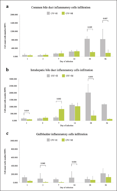 Fig. 3. A comparison of inflammatory cell infiltration at the biliary and GB area of the hamsters and mice infected with O. viverrini from 1 to 56 days. (a) CB. (b) IHB. (c) GB. The comparison data was illustrated with a significant difference, p < 0.05. In the IHB, the inflammatory pattern in both the short and long term exhibited a similar trend to that observed in the CB. On the first day of infection, a significantly high number of infiltrating leukocytes was detected in the OV+H group (p=0.019), but this number declined by day 2 post-infection. At day 7 post-infection, the average number of infiltrating leukocytes in the OV+M group was significantly higher than in the OV+H group (p=0.022). However, at later infection periods (14, 28, and 56 d.p.i.), a higher number of inflammatory cells were detected in the OV+H group. The maximum number of leukocyte infiltrations was significantly found at day 28 (p=0.050) (Fig. 3b). Regarding the GB, minimal levels of inflammation were observed in both the OV+H and OV+M groups. However, a higher infiltration of inflammatory cells was observed in infected hamsters compared to mice. The significantly highest inflammation was found on days 2 and 14 in the OV+H group (p=0.049 and 0.004, respectively) (Fig. 3c). These results indicate that the inflammatory response in the IHB and GB differs between the OV+H and OV+M groups. While the OV+H group exhibits a higher number of infiltrating leukocytes in the IHB and GB during the later stages of infection, the OV+M group shows a relatively higher number of inflammatory cells in the IHB during the early phase of infection. DiscussionOpisthorchis viverrini is classified by the International Agency for Research on Cancer [28] as a Group I biological carcinogen to humans, specifically causing bile duct lesions and cholangiocarcinoma (Group 1) (IARC, 1994). Chronic inflammation resulting from O. viverrini infection is believed to be a risk factor for severe biliary abnormalities (Aksorn et al., 2018; Sripa et al., 2009). This phenomenon typically appears in different locations along the biliary tree (Pungpak et al., 1985; Riganti et al., 1989; Sripa and Kaewkes, 2002). Unfortunately, some individuals affected by O. viverrini infection may ultimately develop cholangiocarcinoma (Ghouri et al., 2015; Parkin et al., 2010; Sripa and Pairojkul, 2008). This bile duct cancer can be classified into 3 subtypes based on anatomical locations: intrahepatic type (iCCA) which develops from either large or small IHBs; perihilar (pCCA), located at the hilar region, and distal CCA (dCCA) arising from the extrahepatic bile duct (EHB) (Bragazzi et al., 2018; Sarcognato et al., 2021). The severity of lesions and symptoms appears to be associated with individual susceptibility, both in human and animal models (Boonmars et al., 2009; Choi et al., 2003; Chung et al., 2004; Khuntikeo et al., 2018). In this study, a systematic investigation of the inflammatory response in different biliary locations and susceptible/non-susceptible animal models was conducted, revealing that O. viverrini infection leads to more severe inflammation in the susceptible hamster model compared to the non-susceptible mouse model. Among the different biliary locations, the inflammation in the IHB was found to be particularly intense. These results suggest that hosts susceptible to O. viverrini infection experience more severe inflammation, especially in the IHB area. Inflammatory cell infiltration including neutrophils, eosinophils, macrophages, lymphocytes, and mast cells, is commonly observed in areas infected by O. viverrini (Bhamarapravati et al., 1978; Lvova et al., 2012; Sripa et al., 2018; Suyapoh et al., 2021a). Studies have reported minimum reactions with neutrophils, macrophages, eosinophils, and lymphocytes in hamsters, occurring in the EHB including CB and GB on days 1–7 of infection (Sripa and Kaewkes, 2002). This suggests that the inflammation may be a response to the migration of juvenile liver fluke [3, 37]; and the secretory antigens by immature parasites [38], the first-line defense mechanisms such as mucus hypersecretion (Kaewkes and Sripa, 2004; Nithikathkul et al., 2007), and the mucosal immune response in bile fluid, specifically involving IgA and IgE (Wongratanacheewin et al., 1988). During migration, immature fluke reaches the IHB and induces a slightly inflammatory response with neutrophils and eosinophils (Bhamarapravati et al., 1978; Sripa and Kaewkes, 2000). As the flukes develop into adult worms, they are commonly detected in the larger ducts of the intrahepatic biliary tree (Pungpak et al., 1985; Pungpak et al., 1989). Mature O. viverrini worms induce strongly cell-mediated immune responses in the periductal area (Bhamarapravati et al., 1978; Sripa et al., 2018). Various animal studies have described patterns of leukocyte infiltration, where chronic inflammation with intense mononuclear cells, a moderate number of eosinophils, and mast cells are detected after a week post-infection (Bhamarapravati et al., 1978; Sripa and Haswell, 2021; Sripa and Kaewkes, 2000). In heavy infection with O. viverrini, the worms can be found in other locations, including EHB, PD, GB, and CB (Pungpak et al., 1985; Pungpak et al., 1989). The adult helminths are more frequently detected in GB than in the CB, likely due to the larger space available in the GB. Gross findings may reveal thickening, opacity, and dilatation of the GB (Boonmars et al., 2009; Wonkchalee et al., 2011). Microscopically, mild-to-moderate infiltrations of eosinophils and mononuclear cell infiltration can be seen 7–14 d.p.i. (Sripa and Kaewkes, 2002). The severity of inflammation depends on the number of flukes in close contact with the mucosal surface of those organs (Sripa and Kaewkes, 2002). The mechanisms of hepatobiliary inflammation initiated by adult flukes of O viverrini are multi-factorial and involve various factors, including mechanical damages, bacterial colonization, 