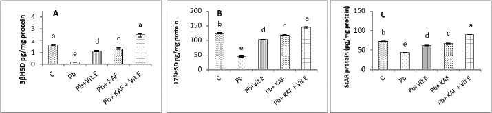 Fig. 1. Testicular steroidogenic enzyme activities and StAR protein levels in experimental rats. (A) 3β-HSD: 3β-Hydroxysteroid dehydrogenase, (B) 17β-HSD: 17β- Hydroxysteroid dehydrogenase, and (C) StAR protein: Steroidogenic acute regulatory protein. Various letters were referred to statistical differences among groups at level (p < 0.05). (C): Control group, (Pb): Lead acetate group, (Pb + Vitamin E): Lead acetate + 100 mg/kg.b.w of vitamin E group, (Pb + KAF): Pb + 50 mg/kg.b.w. of kaempferol group, and (Pb + KAF + Vitamin E): Pb + 50 mg/kg.b.w. of kaempferol + 100 mg/kg.b.w. of vitamin E group.