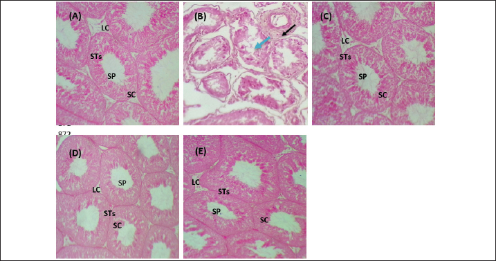 Fig. 6. Photomicrographs of testicular tissues in experimental groups. (A): Control group: showed a typical feature of testicular architecture with normal Sertoli cells and Leydig cells as well as complete spermatogenesis series. (B) Pb group: showed congestion (black raw), edema (blue raw), and degenerative seminiferous tubules and Sertoli cells with losing spermatogenic cells. (C): Pb + Vitamin E: showed that the Sertoli cells and Leydig cells returned to their normal structure and were occupied with little spermatozoa. (D): Pb + KAF: showed that the seminiferous tubules, germinal epithelia, and Sertoli cells return to normal texture. (E): Pb + KAF + Vitamin E: showed regeneration of the testicular cells and return to normal architecture as normal Leydig cells, and Sertoli cells with active spermatogenesis series. H&E, (100×). LC: Leydig cells, SC: Sertoli cells, STs: seminiferous tubules, and SP: spermatozoa. Importantly, the administration of kaempferol and vitamin E with Pb can enhance the regeneration and recovery of the testicular tissue and appear to possess a typical architecture as that shown in control male rats, with normal appearance of the Sertoli cells, Leydig, germ cells, and seminiferous tubules occupied with different stages of normal spermatocytes, and the spermatogenesis series were evident (Fig. 6E). The histological findings of rat’s testes co-treated with KAF plus lead acetate group and vitamin E plus lead acetate group showed that the seminiferous epithelia and interstitial cells return to normal architecture of Sertoli cells and seminiferous epithelia with moderate spermatogenesis (Fig. 6C and D). DiscussionLead acetate exposure can induce testicular damage via an imbalance between the production of antioxidant/removal-free free radicles, leading to testicular oxidative stress. The present experiment was conducted to study the effect of kaempferol on reproductive toxicity induced by lead acetate and compare its action with the impact of vitamin E in male rats. Lead exposure generates testicular oxidative stress via the downregulation of antioxidants and upregulation of ROS production, resulting in oxidative stress and, subsequently, apoptosis (Li et al., 2018). In current study showed that exposure to lead acetate led to increase testicular NO and MDA with decreased testicular CAT, SOD, and GPx, which is consistent with a previous study (Udefa et al., 2020). It had been observed that lead acetate caused tissue damage via two distinct mechanisms, including excessive generation and accumulation of ROS in testicular tissues, which includes singlet oxygen, hydrogen peroxides, hydroxy radicals, and RNS, as well as direct exhaustion of antioxidant pool (Talpur et al., 2018, Elsheikh et al., 2022). Pb has a higher affinity to bind with sulfhydryl groups and suppress the functional thiol;-SH groups (sulfhydryl) groups, of SOD, GPx, and CAT; and it can replace the divalent bio-elements such as selenium, zinc, and magnesium that serve as an essential cofactor of antioxidant enzymes that caused a significant depletion of these antioxidant enzymes in testicular postmitochondrial and mitochondrial fractions in rats exposed to lead acetate (Udefa et al., 2020, Elsheikh et al., 2022). The current experiment shows an increase in the testicular NO levels in rats treated with lead acetate that may be due to elevated biosynthesis and activity of testicular nitric oxide synthase (iNOS) resulting from lead acetate accumulation in testicular tissues; the present results are consistent with that results obtained from Matović et al. (2015) who reported that exposure to lead acetate led to raise the cellular NO level resulting in fragmentation of cellular lipid and DNA. Importantly, the impacts of kaempferol have not yet been completely identified on the reproductive system. Current results revealed that the administration of kaempferol following exposure to lead caused elevation in the levels of CAT, GPx, and SOD, whereas MDA and NO were reduced relative to their levels in rats treated with vitamin E and/or lead only; this may be attributed to the antioxidant ability of kaempferol to suppress the activities of pro-oxidant enzymes such as xanthine oxidase that responsible for generating ROS (Lim et al., 2023). Kaempferol, like other flavonoids, can chelate with cuprous or ferrous ions in Fenton’s reaction, ultimately leading to prevent lipid peroxidation of cytomembrane, as well as; kaempferol increases the expression and activity of CAT, GPx, and SOD, as found by (Lim et al., 2023). Furthermore, kaempferol possesses a double bond at C3-C2 and hydroxyl groups at C5, C3, and C4, and an oxo group at C4 which might explain its powerful antioxidant properties (Imran et al., 2019); the current results consistent with (Albrakati et al., 2021) who concluded that kaempferol can suppress lipid peroxidation and NO production with increase generation of antioxidants in neurotoxic rats. The results of the current study are consistent with (Oyeyemi et al., 2022), who reported that vitamin E could reduce testicular MDA and NO concentrations when co-administered with lead acetate due to suppress phospholipid membrane peroxidation and protect testicular cell membranes via its lipophilic properties (Malmir et al., 2021); in addition, tocopherols-OH can replace their hydrogen atom to a single electron of free radicle and removing it before the free radicle binds with cell membranes, so vitamin E considers as a nonenzymatic defense mechanism in testicular mitochondria (Ahmed et al., 2020, Malmir et al., 2021) that effects on the testicular NO and MDA levels in Pb cotreated with vitamin E. The ability of kaempferol with vitamin E to reduce MDA and NO whereas enhancing the antioxidant enzymes in rats indicates that both kaempferol and vitamin E acted additively to reduce the testicular oxidative stress, that consistent with the findings of (Shrivastava et al., 2017, Oyeyemi et al., 2022). Importantly, 