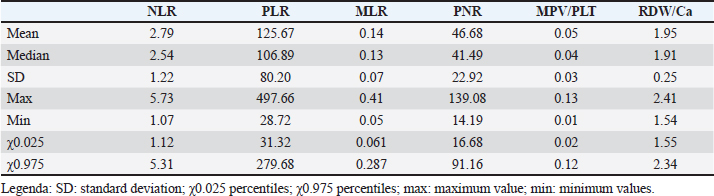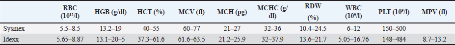 AbstractBackground: Canine lymphoma is the most common hematopoietic cancer in dogs. Numerous studies have evaluated the prognostic value of hematological abnormalities and ratios in both humans and dogs with lymphoma. Aim: To compare hematological parameters and complete blood count ratios between a population of dogs affected by lymphoma and healthy dogs to identify potential prognostic markers for lymphoma. Methods: This retrospective case-control study compares hematological parameters and complete blood count ratios between a population of 114 dogs affected by multicentric large B-cell lymphoma (LBCL) and 60 healthy dogs. Results: The study found several statistically significant differences between the hematological indices of LBCL dogs and healthy dogs, but no correlation between these parameters and the survival times of 78 dogs treated with chemotherapy Madison Wisconsin protocol. In addition, hematological alterations were evaluated such as anemia, leukocytosis, and thrombocytopenia. Conclusion: Hematological ratios have been suggested as potential prognostic markers for canine LBCL but their real prognostic value remains controversial and requires future investigation. Keywords: Dogs, Lymphoma, CBC, Indices, Ratios. IntroductionCanine lymphoma is the most prevalent hematopoietic malignancy in dogs. This term encompasses a group of heterogeneous diseases that differ in clinical presentation, immunophenotype, and prognosis (Valli et al., 2013; Zandvliet, 2016; Antognoni et al., 2021; Magni et al., 2023). Canine Lymphoma is a correspondent to non-Hodgkin Lymphoma in humans. Large B-cell lymphoma (LBCL) is the most frequent immunophenotype of multicentric lymphoma in dogs. Typically, lymphoma is diagnosed in middle-aged or dogs older than 10 years. Although no significant gender predisposition has been demonstrated, spayed females appear to have an increased risk (Zandvliet, 2016). The most widely used therapy for canine lymphoma consists of a multidrug combination (CHOP-based protocol) of cyclophosphamide, doxorubicin, vincristine, prednisone, and l-asparaginase without maintenance further therapy. The neoplasm is extremely aggressive, with a median survival time under treatment of approximately 8–10 months in dogs with LBCL (Bienzle and Vernau, 2011; Valli et al., 2013; Zandvliet, 2016). Many prognostic factors have been considered significant for LBCL, including clinical symptoms, stage, histological aspects, grade, proliferation markers, and response to treatment (Zandvliet, 2016; Davies et al., 2018). Given the aggressive behavior of LBCL, prognostic markers that allow monitoring the course of the disease in an easy, repeatable, and inexpensive way, are of critical importance. Many studies have focused on hematological parameters as potential prognostic markers. The hematologic examination is a minimally invasive procedure available to all veterinary clinicians, and it is routinely executed before chemotherapy administration. Several hematological parameters both in human and veterinary medicine have been proposed as prognostic markers for many different diseases, including vascular (Balta et al., 2016), degenerative (Wan et al., 2020), and inflammatory diseases (Neumann, 2021), as well as different types of tumors, such as soft tissue sarcoma (Macfarlane et al., 2016), laryngeal carcinoma (Yılmaz et al., 2018), acute myeloid leukemia (Zhang et al., 2021), and lymphomas (Henriques et al., 2021), and others. The possibility to use neutrophils/lymphocytes ratio (NLR) as an independent prognostic factor has been investigated in human patients with LBCL. To date, a high NLR value has been found to be associated with poor overall survival and poor progression-free survival. At the time of diagnosis, an NLR cut-off value of 3 has been reported in one study (Wang et al., 2017), and 3.5 in another (Porrata et al., 2010). This association between a high NLR and poor prognosis may be related to the production of inflammation mediators, resulting in immunosuppression and a reduction in the patient’s immune efficacy. In addition, a high platelets/lymphocytes ratio (PLR) appears to be correlated with a worse clinical condition of the patient and a poor prognosis in human LBCL, as reported by a 2019 meta-analysis study (Chen et al., 2019). In veterinary medicine, the predictive value of platelets/neutrophils ratio (PNR), NLR, and the level of anemia as prognostic factors in dogs with a diagnosis of LBCL has been suggested. Patients with a higher PNR above 0.032 showed earlier disease progression than others, while patients with NLR above 7.5 showed a higher mortality rate at 180 days (Henriques et al., 2021). On the other hand, several studies in both human and veterinary medicine have failed to demonstrate a statistically significant association between NLR and overall survival or progression-free survival (Mutz et al., 2015; Azuma et al., 2019). In humans, multiple studies have identified higher red blood cell (RBC) distribution width (RDW) as a negative prognostic factor in patients with LBCL (Zhou et al., 2017; Ai et al., 2018; Hasan and Elmeshhedany, 2021). In dogs, the prognostic value of this index has been investigated for a few diseases (Guglielmini et al., 2013, 2021, 2022; Garcia-Arce et al., 2022; Miglio et al., 2023) and only one study considered LBCL (Martinez et al., 2019). Furthermore, to date, the red blood cell distribution width to total serum calcium ratio (RDW/Ca) has been investigated and suggested as a ratio of prognostic relevance only in patients with acute pancreatitis, in both humans (Gravito-Soares et al., 2018; Han et al., 2021) and canine species (Guglielmini et al., 2022). However, the prognostic value of these hematological ratios in canine LBCL remains controversial and under investigated. Most of the existing studies conducted on this topic lack a control group of healthy patients for comparison. The main objective of the study is to assess the role o