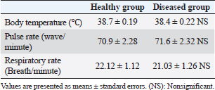 Table 3. Serum concentration of hepato-cardiac enzymes, urea, and creatinine in healthy and diseased animals.