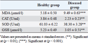 Table 4. Serum concentration of different oxidant/antioxidant parameters in healthy and diseased animals.