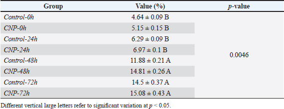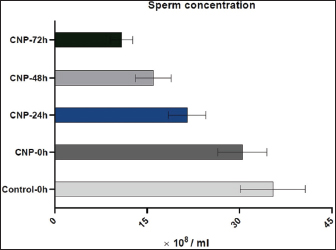 Fig. 3. CNP effect on the concentration of ram sperms during three days of cooling preservation. Genetic expression of hNPR-BDuring 3 days of cooling, the findings of the hNPR-B gene were elevated significantly (p < 0.05) in CNP-treated sperms at 0 (5.18 ± 0.75), 24 (4.45 ± 0.51), 48 (3.81 ± 0.97), and 72 hours (2.92 ± 0.62) when compared to control groups (1.50 ± 0.50, 1.30 ± 0.42, 1.20 ± 0.25, and 1.10 ± 0.15, respectively). Although significant decreases (p < 0.05) in the expression of the hNPR-B gene were detected in CNP-treated sperms with advancing days of cooling, the values of this group remain higher than those of control at all times of cooling (Fig. 8).