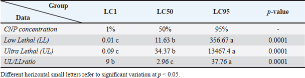 Fig. 1. Collection and maturation of sperm samples from epididymis. Statistical analysisThe t-test, One- and Two-Ways ANOVA in the GraphPad Prism Software (version 6.0.1) were served to detect significant variation between the values of different study groups at p < 0.05. The study values appeared as Mean ± Standard Errors (M±SE) (Gharban, 2023). Ethical approvalThis study was licensed and supervised by the Scientific Committee of the Department of Surgery and Obstetrics in the College of Veterinary Medicine (University of Baghdad, Baghdad, Iraq). ResultsCNP-toxicity and effective dose of spermSignificant variation ( p < 0.0001) between values of LC1 (0.03 pg/ml), LC50 (19.997 pg/ml), and LC95 (2191.964 pg/ml) was seen in the current study; however, the lowered CNP toxicity and suitable dose of sperms suspension treated with CNP was LC1 (0.01 x 10−13) (Table 1). Sperms qualityIndividual motility of sperm suspensions was increased significantly in CNP-0h (75.845 ± 1.43); and reduced significantly in CNP-48h (27.89 ± 2.46) and CNP-72h (2.545 ± 0.35) but not in CNP-24 hours (53.66 ± 2.34) when compared to control groups (Table 2). Value of live sperms in CNP-0h group (77.5 ± 1.1) was differed insignificantly (p > 0.05) when compared to control-0h (82.63 ± 0.89) and control-24h (81.265 ± 0.95) groups; however, gradual significant decreases (p < 0.05) were observed in values of CNP-24h (68.6 ± 1.33), CNP-48h (60.78 ± 0.98), and CNP-72h (36.4 ± 1.21) in comparison with those of control-48h (60.78 ± 0.98) and control-72h (49.215 ± 0.93), (Table 3). Values of abnormal sperms were increased significantly (p < 0.05) in both control and CNP groups at the time of 24 (6.29 ± 0.09 and 6.97 ± 0.1, respectively), 48 (11.88 ± 0.21 and 14.81 ± 0.26, respectively), and 72 hours (14.5 ± 0.37 and 15.08 ± 0.43, respectively) when compared to values of CNP-0h (5.15 ± 0.15) and control-0h (4.64 ± 0.09) groups (Table 4, Fig. 2). Significant decreases (p < 0.05) in sperm concentration were started gradually in CNP-24h (21.51 ± 3.05), CNP-48h (10.06 ± 2.87), and CNP-72h (10.89 ± 1.77) when compared to values of CNP-0h (30.49 ± 3.98) and control-0h (35.41 ± 5.29), (Fig. 3). Table 1. Toxicity study of CNP addition and determine the effective dose of LC1, LC50, and LC95 on ram sperms.