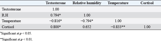 This experiment was done twice on the three farms. Statistical analysisThe data’s normal distribution was assessed through the application of the Kolmogorov-Smirnov test, and subsequent statistical analysis was performed utilizing JMP software, specifically version 11.0.0, developed by SAS Institute in Cary, NC 11. Independent sample t-tests were employed for comparing means. Figures were created using Graphpad Prism v5 software, which is developed by (Graphpad Software, Inc., San Diego, CA). To analyze correlation coefficients (r) between testosterone, relative humidity, temperature, and cortisol, a correlation coefficient matrix was employed. In addition, a linear regression relationship was used to examine the association between testosterone, relative humidity, temperature, and cortisol. The different means were determined to have statistical significance at a significance level of p < 0.05.