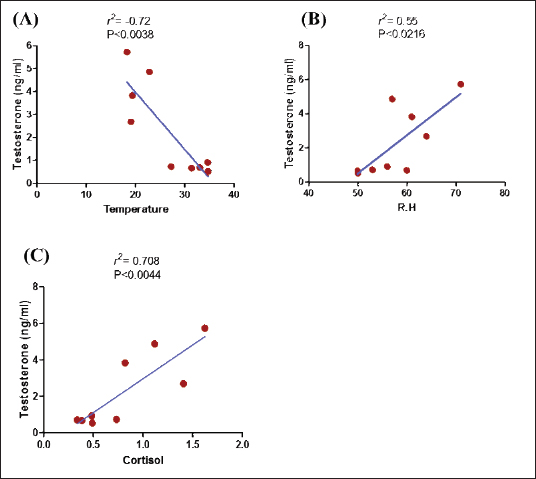Fig. 3. Relationship between testosterone level (ng/ml) and temperature (A), testosterone level (ng/ml) and relative humidity (R.H) (B), and testosterone level (ng/ml) and cortisol (µg %) (C) in male camels.