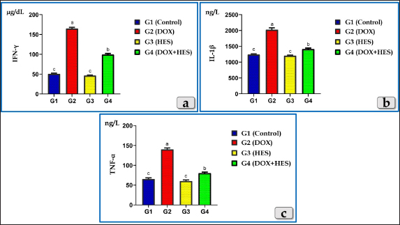 Fig. 3. Showing the effect of DOX and HES on the tested Pro-inflammatory Cytokines; Interferon γ (IFN-γ), Interleukin 1β (IL-1β) and Tumor necrosis factor α (TNF-α) for all experimental groups. According to Duncan multiple test, the different letters (a–c) are significantly different between treatments at the P < 0.05 level.