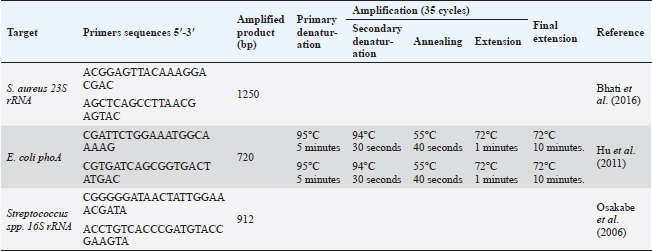 Blood sampleJugular venipuncture was used to get ten ml of blood from each animal. The drawn blood was added to EDTA-containing tubes, heparin-containing tubes, and plain tubes (i.e., anticoagulant-free) to obtain whole blood, heparinized plasma and serum, respectively. All samples were chilled using crushed ice before being brought right away to the laboratory for additional processing. Whole blood tubes were used for both the PCR assay and complete blood count (CBC). Microbiological analysis of milk specimensSamples of milk with a CMT score of +2 or +3 and SCC greater than 200,000/ml were used for the bacteriological test. 10 ml of milk were dispersed using the quadrant streaking method on a 5% sheep blood agar plate. The medium was then examined for typical bacterial colonies after being incubated at 37°C for 24–48 hours. Following their dissemination on brain heart infusion agar, pure colonies on blood agar were incubated for 24 to 48 hours at 37°C in an aerobic environment (Mbindyo et al., 2014). At this stage, the Gram reaction, culture, and shape were used to identify the bacterium (Ewing, 1986). Staphylococcus aureus was located using selective media such as Mannitol salt agar and Baird–Parker agar. As representative colonies, black gram-positive cocci colonies with a clear zone surrounding them were chosen and subjected to a catalase test (Staphylex, Oxoid). Staphylococcus aureus was discovered in colonies that lacked catalase but had hemolysis. To isolate Streptococcus, all isolate clones that seemed to be gram-positive were dispersed on sheep blood agar slants with 1% esculin (Oxoid, UK). Catalase-negative Streptococci isolates were then cultured on kanamycin-esculin-azide agar (Oxoid) after drops of hydrogen peroxide were applied to already-growing cultures. Gram-negative bacilli colonies were then distributed on MacConkey agar plates for isolating Escherichia coli, where the pink color of the bacterial colonies indicates that E. coli is growing. The most probable number (MPN) method, which uses three tubes, was used to confirm the E. coli isolates. The positive MPN tube was disseminated on Eosin methylene blue (EMB) agar and allowed to develop overnight at 35°C. A green metallic sheen dye is produced around the bacterial growth in 24–36 hours. Bacterial identificationStaphylococcus aureus, E. coli, and Strept. spp. standard bacterial reference strains ATCC 25922, 25922, and 15913 were received for comparison from the veterinary quality control on poultry production, Animal Health Research Institute, Cairo, Egypt. The QIAamp DNA Mini kit (Qiagen, Germany, GmbH) was used to extract DNA from milk samples, with certain modifications made in accordance with the manufacturer’s instructions. 200 µl of the sample suspension was incubated with 10 µl of proteinase K and 200 µl of lysis buffer at 56°C for 10 min. After incubation, 200 µl of 100% ethanol was added to the lysate. The sample was then washed and centrifuged following the manufacturer’s recommendations. Elution buffer (100 µl) was used to elute the nucleic acid. The primers utilized were given by Metabion (Germany) and are listed in Table 2. Primers were utilized in a 25 µl reaction containing 12.5 µl of EmeraldAmp Max PCR Master Mix (Takara, Japan), 1 µl of each primer of 20 pmol concentrations, 5.5 µl of water, and 5 µl of DNA template. An applied biosystem 2,720 heat cycler was used to carry out the process. On a 1.5% agarose gel (Applichem, Germany, GmbH) in 1× TBE buffer at room temperature, the PCR products were separated using 5 V/cm gradient electrophoresis. Each gel slot had 20 µl of the m-PCR products put into it for gel analysis. The sizes of the fragments were measured using a gelpilot 100 bp plus ladder (Qiagen, Gmbh, Germany), a generuler 100 bp ladder (Fermentas, Germany), a 100 bp DNA ladder H3 RTU (Genedirex), and a generuler 100 bp ladder. Computer software was used to analyze the data after the gel was photographed by a gel documentation system (Alpha Innotech, Biometra). Table 2. Primers sequences, target genes, amplicon sizes, and cycling conditions.