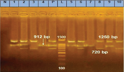 Fig. 1. m-PCR assay, amplifying fragments of 720, 912, and 1250 bp were amplified for E. coli, Strept. spp., and S. aureus, respectively. Lane1: 100–1500 bp marker, Lanes p: positive control of E. coli, Strept. spp., and S. aureus standard strains, Lane N: negative control with no DNA, Lanes 2, 3, 6, 8, and 10 positive for E. coli, Lanes 1, 2, 4, 5, 6, 7, and 9 positive for Strept. spp., Lanes 1, 2, 5, 6, 8, 9, and 10 positive for S. aureus. Table 6. Pathogen existence in milk.