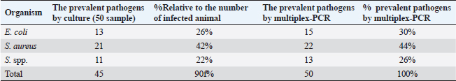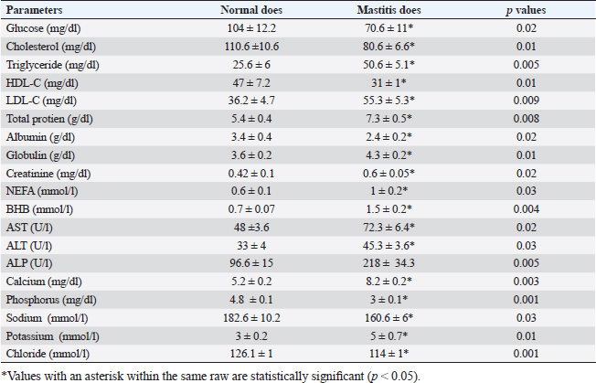 The culture method confirmed the presence of the mastitic pathogens in 95% of milk samples and m-PCR results committed their presence in 100% of milk samples. Whereas, S. aureus was identified in 42% of raw milk samples by culture method and in 44% of raw milk samples by m-PCR method. These results were in agreement with those reported in (43.1%) of dairy does in Italy (Cortimiglia et al., 2015) but lower than found in (50%) of buffalo in Bangladesh (Talukder et al., 2013), (76.9%) of goats in Sardinia (Spanu et al., 2013), and higher than those recorded in (30%) of cow in Egypt (Saad et al., 2019), (38.3%) of sheep and goats in Turkey (Abdallah et al., 2018), (35%) of goat in India (Mishra et al., 2018), (4.5%) of camels at Matrouh Governorates, Egypt (Darwish, 2023), and (13.5%) of goat in Brazil (Rupp et al., 2019). According to Le Loir et al. (2003), inappropriate hygiene procedures, handling of animals during milking, and milk storage could all be contributing factors to the spread of Staphylococcus spp. in milk. In the present data, the isolation rate of E. coli by culture method was 26% and by m-PCR was 30% (focusing on the phoA gene). Our findings were consistent with Sameer et al. (2013) (26.67%) in Egypt, but higher than those reported by Abd El-Tawab et al. (2018) (9.5%) in Sharkia and Dakahlia Governorates, Egypt, Darwish (2023) (12.7%) at Matrouh Governorate, Egypt, Lan et al. (2020) (18.5%) in China, Haftay et al. (2016) (21.3%) in Ethiopia and lower than percentages reported by Abdallah et al. (2018) and Saad et al. (2019) (44% and 36.8%, respectively) in Egypt and Machado et al. (2018) (51.9%) in Brazil. The highest prevalence of E. coli as an environmental pathogen in milk samples from infected goats may be attributed to management errors such as overcrowding, insufficient ventilation, inadequate manure removal, subpar hygienic conditions, and an overall deficiency in farm cleanliness and sanitation (Abdallah et al., 2018). Table 8. Biochemical parameters of healthy (N=50) and mastitic (N=50) Shami goats.