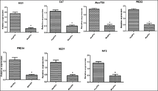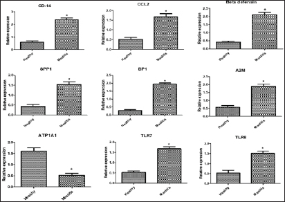 Fig. 2. Relative expression patterns of immune genes in healthy and mastitic Shami goats. Results are expressed as means ± SEM. *p < 0.05. Table 7. Hematological parameters of normal (N=50) and mastitic (N=50) Shami goats.