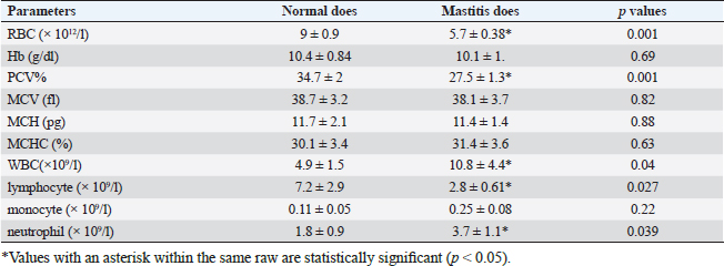 Gene expression configuration of immune and antioxidant markersThe immunological and antioxidant markers’ gene expression profiles are displayed in Figures 2 and 3. Mastitis-affected does have significantly greater expression levels of the genes CD-14, CCL2, β defensin, SPP1, BP1, A2M, TLR7, and TLR8 than resistant does. Mastitis-affected does have significantly lower expression of the genes ATP1A1, SOD1, CAT, AhpC/TSA, PRDX2, PRDX4, NQO1, and Nrf2 than resistant does. Hemato-biochemical and immunological alterations associated with goat mastitisThere were significant (p < 0.05) elevations in WBCs and neutrophils count while significant (p < 0.05) decreases in RBCs, PCV, and lymphocytes count in mastitic does as compared with healthy does (Table 7). However, Hb, MCV, MCH, MCHC, and monocyte count were non-significantly altered (p ≥ 0.05) in mastitic does in relation to the control group (Table 7). There were significant (p < 0.05) augments in serum values of BHB, NEFA, triglycerides, LDL-C, AST, ALT, ALP, creatinine, total protein, globulin, calcium, and potassium with significant (p < 0.05) declines in serum concentrations of glucose, cholesterol, HDL-C, albumin, sodium, chloride, and phosphorus in mastitic does compare to healthy ones (Table 8). There were significant (p < 0.05) rises in serum levels of GPx and MDA with significant (p < 0.05) reductions in serum concentrations of GSH, SOD, and catalase in mastitic does in comparison with healthy ones (Table 9). There was a significant (p < 0.05) increase in APPs and cytokines concentrations in mastitic does in relation to healthy ones (Table 9). ROC curve analysis of the estimated APPs and pro-inflammatory cytokines cleared that they yielded at AUC=1, sensitivity, and NPV as 100%, with high PPVs and ARs (more than 70%) while their specificities and LRs were low. They were almost equal but TNF-α and SAA had unique percentages of increase of 256.37% and 234.78%, respectively (Table 10). DiscussionMastitis, especially in the postpartum period, is the term used to describe the inflammation of one or more of the mammary gland tissues that customarily occur before lactation (Ondieki, 2018). Infections are typically characterized by local inflammatory symptoms, yet depending on how severe the infection is, systemic symptoms may also be present (Mohammed et al., 2016).