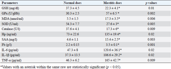 Table 9. Oxidative stress markers, acute phase proteins and pro-inflammatory cytokines in normal does (N=50) and those with clinical mastitis (N=50).