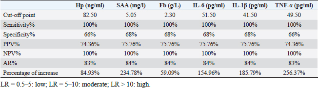 According to our investigation, 22% of Strept. spp. (n=11) were found in milk samples of mastitic Shami goats while m-PCR showed the presence of 26% of Strept. spp. (n=13) (two more isolates than culture). This was almost the same results reported in 22.5% of dairy cows in China (Ding et al., 2016), and 23% of cows in India (Mishra et al., 2018). 25% of goats in Egypt (Mohamed, 2022), but less than other studies reported (31.2%) of cows in Egypt (Saad et al., 2019), 65% of bovine in Nigeria (Amosun et al., 2010), and higher than 8.7% of cattle in China (Han et al., 2022), 9% of cattle in Pakistan (Ali et al., 2021), 12% of cattle in Egypt (Ahmed et al., 2020), 15.4% of camels in Egypt (Darwish, 2023), 17.4% of small ruminant farms in Denmark (Chatzopoulos et al., 2020). Changes in topographical features and management practices may be to blame for the variation in the percentage of isolated Strept. spp. Table 10. ROC curve analysis of the estimated acute phase proteins and cytokines in mastitic does compare to normal does.