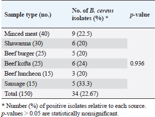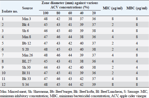 Table 5. Inhibitory zone diameters, MIC, and MBC of ACV against MDR B. cereus isolates (n=12) recovered from meat and meat products.