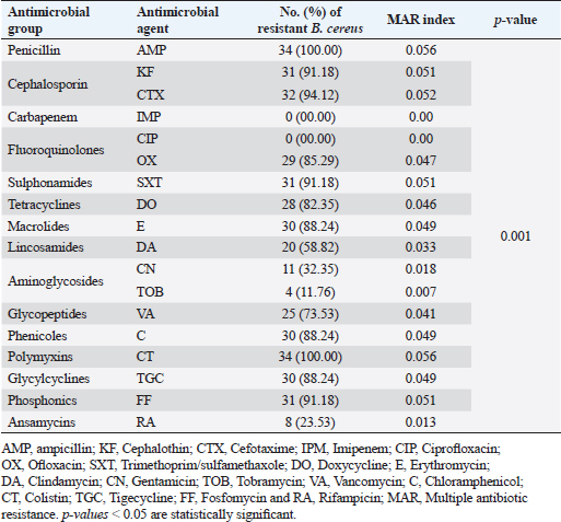 Antibiogram of B. cereus isolatesThirty-four B. cereus isolates were tested for in vitro antimicrobial susceptibility to 18 different antimicrobial agents. The results showed that all of the isolates were sensitive to ciprofloxacin and imipenem (100%, each) followed by clindamycin (26.47%), tobramycin (20.59%), vancomycin (20.59%), rifampicin (17.60%), and gentamicin (14.70%). However, all of the B. cereus isolates were resistant to the following drugs: ampicillin and colistin (100%, each), cefotaxime (94.12%), sulfamethoxazole-trimethoprim (91.20%), cephalothin and fosfomycin (91.18% each), chloramphenicol, erythromycin and tigecycline (88.23% each), ofloxacin (85.29%) and doxycycline (82.35%). It is interesting to note that every B. cereus isolate had an MDR (resistant to at least three antimicrobial classes) MAR index, ranging from 0.55 to 0.77, which was significantly higher than 0.3 (Table 3). Statistical analysis exposed a significant difference (p < 0.05) in the resistance of B. cereus isolates to tested antimicrobials. The frequency of B. cereus susceptibility to selected antimicrobial agents and their resistance pattern is shown in Table 4. Antimicrobial activity of ACV against B. cereusAs presented in Table 5, all ACV concentrations (100%, 80%, 60%, 40%, and 20%) exhibited marked inhibitory activities against B. cereus isolates while applying the agar well diffusion assay. The inhibitory zone diameters ranged from 44–48 mm/100%, 42–46 mm/80%, 38–44 mm/60%, 37–42 mm/40%, and 36–39 mm 20% concentrations. To determine precisely the antimicrobial properties of ACV, MICs, and MBCs were necessarily performed on 12 MDR B. cereus isolates. The MIC results showed that ACV exhibited strong antimicrobial activities against examined isolates with MIC ranging from 2 to 8 μg/ml. MIC50 and MIC90 of ACV against the examined isolates are 4 and 8 μg/ml, respectively. Some of the examined isolates showed MBC value at the same MIC value, considering the AVC as a bacteriocidal agent. Biofilm production by B. cereus isolatesThe qualitative recognition of biofilm on Congo red agar indicated that B. cereus biofilm producers (8/12; 66.67%) could alter transforming the media’s red hue into black because of sucrose consumption. On trypticase soya broth, 12 B. cereus isolates were cultured for quantitative detection of biofilm production. Three B. cereus isolates (25%) were strong biofilm producers, 3 (25%) were moderate, and 6 (50%) produced weak biofilm (Table 6). The results indicated that the quantitative detection of the biofilm is more accurate than the qualitative method using the Congo red agar. Table 3. Antibiogram of the B. cereus isolates recovered from meat and meat products.