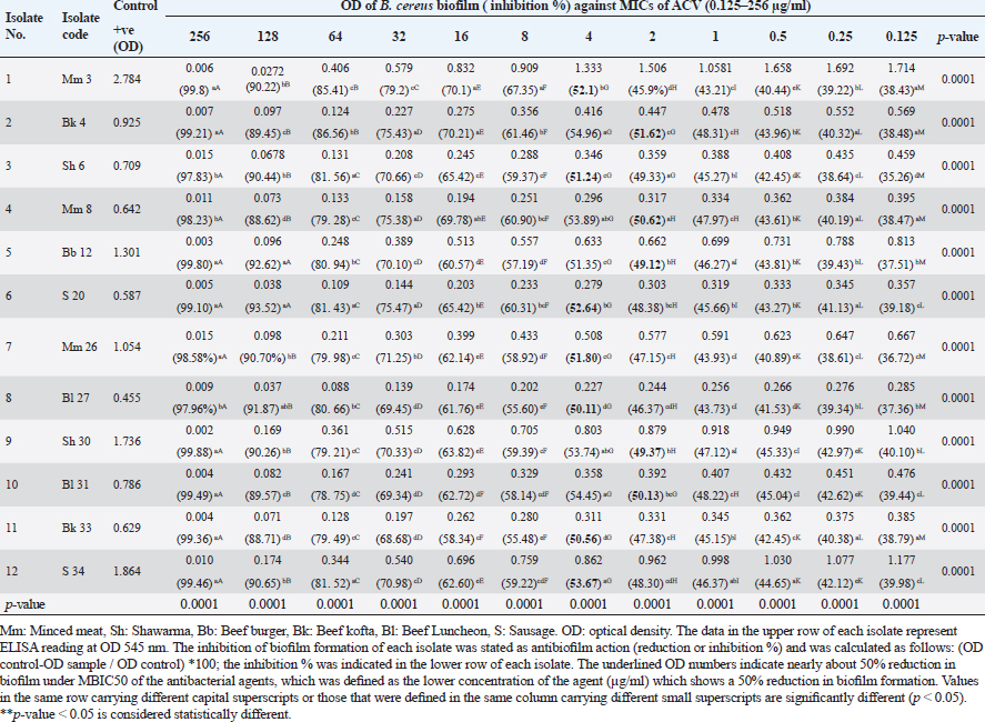 Antibiofilm activities of ACV against MDR B. cereus isolatesThe ability of ACV to stop the development of biofilms in isolated B. cereus was investigated and the findings were compared with the untreated (positive control) B. cereus biofilm producer in addition to the negative control (Table 7). The inhibition of biofilm development in every isolate was expressed as antibiofilm activity and reported as inhibition or reduction %. Increasing the concentrations of the tested agent resulted in a significant (p ˂ 0.05) decrease in biofilm formation in all cases. The antibiofilm effect of ACV against biofilms produced by B. cereus isolates was found to be good, with over 50% inhibition of biofilm development. The most common minimum biofilm inhibitory concentration (MBIC50) was 4 μg/ml (Table7). Table 4. Frequency of antimicrobial resistance in B. cereus isolates (n=34) recovered from meat and meat products.