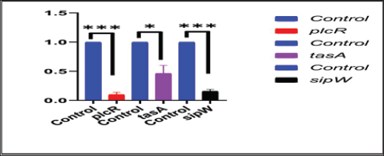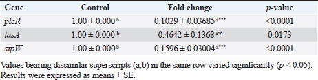 Fig. 1. Effect of ACV on the expression levels of B. cereus plcR, tasA, and sipW biofilm genes using RT-qPCR. Table 8. Transcriptional analysis of biofilm genes using RT-qPCR after treatment with ACV.