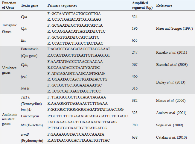 PCR toxin genotyping and resistance determinants of CP isolatesThe distribution of different toxin, virulent, and antibiotic-resistant genotypes of the 10 PCR-selected CP strains in this study compared with their phenotype and their antibiotic resistance pattern was depicted in Table 4. PCR confirmed that all selected isolates of CP were of type A as they all carried cpa gene; however, cpb gene was detected in (type B only) in sheep and goats and type D exhibited their genes of Cpa, Cpb, and Etx toxin genes altogether in some isolates. For virulence determinants, the enterotoxin (Cpe) gene was found in 40%, 30%, and 30% of tested ten strains in cattle, sheep, and goat species, respectively. Meanwhile, the beta2 toxin (Cpb2) gene was discovered in 40% of each of the tested cattle and sheep CP isolates but in 30% of ten tested goat strains. Interestingly, PCR could not detect netB and tpeL virulent genes at all in the tested strains in all species. Table 4. Distribution of toxin genotyping, virulence determinants, and antibiotic resistance profiles in different isolates of CP.