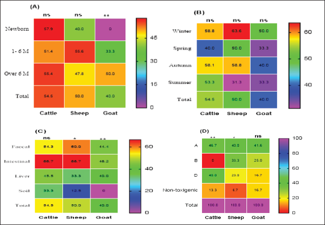 Fig. 1. Frequency of CP and their toxin types in cattle, sheep, and goat according to different variants. Table 2. Relation of CP in different animals with animal health conditions.