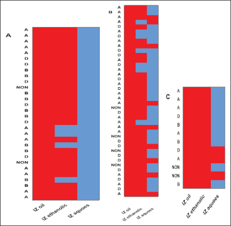 Fig. 5. Relationships between different treatments of Moringa plant (M. oleifera) and toxins of CP isolates from sheep (a), cattle (b), and goat (c). Red cells indicate the sensitive antibacterial effects of different Moringa treatments (oil or extracts) while blue cells indicate the resistance pattern of Moringa oil or other extracts. (A) Indicates CP isolates of type A, (B) indicates CP isolates of type B, (D) indicates CP isolates of type D, (NON) indicates nontoxigenic strains. IZ oil: inhibition zones that were recorded by the oil of the Moringa plant. IZ ethanolic: inhibition zones that were recorded by ethanolic extract of the Moringa plant. IZ aqueous: inhibition zones that were recorded by aqueous extract of the Moringa plant.