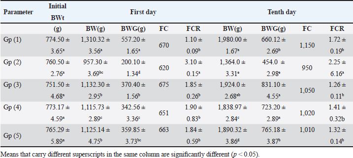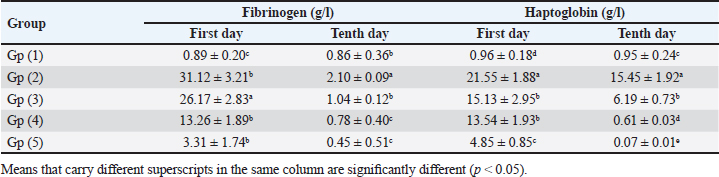 Table 5. Effect of toltrazuril and neem extract on the inflammatory markers (FGB and hepatoglobin) in infected broilers with E. tenella.