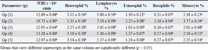 When broilers were experimentally infested with E. tenella, their white blood cell (WBC), lymphocytes, heterophiles, eosinophils, basophils, and monocytes were compared with the (-ve control) significantly increased (Table 2). However, when broilers were experimentally infested and treated with either toltrazuril or neem leaf extract alone or in combination, their WBCs, lymphocytes, heterophiles, eosinophiles, basophiles, and monocytes were significantly decreased when compared with the +ve control. Table 2. Effect of toltrazuril and neem extract 4% on total and differential leukocytic count in infected broilers with E. tenella.