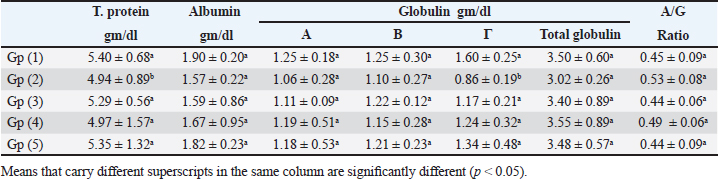 When compared to the -ve control, broilers that were experimentally infested had significant decreases in serum total protein and γ globulin, but only marginal decreases in albumin, α, β, total globulin, and A/G ratio. In addition to a negligible rise in albumin, α, β, γ, total globulin, and A/G ratio as compared to +ve control broilers, experimentally infected broilers treated with toltrazuril or neem alone or in combination showed significant increases in serum total protein (Table 3). When compared to healthy broilers (-ve control), experimentally infested broilers with E. tenella showed significant decreases in serum nitric oxide, lysozyme, phagocytic percent, and phagocytic index. However, when compared to +ve control broilers, broilers treated with toltrazuril or neem extract individually showed significant increases in nitric oxide, lysozyme, phagocytic percent, and phagocytic index (Table 4). Table 3. Effect of toltrazuril and neem extract 4% on protein profile in infested broilers with E. tenella.