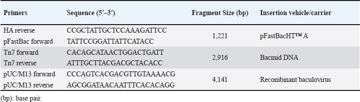 Generation of the recombinant baculovirusRecombinant baculoviruses were generated by transfection of Sf9 cells at 80% confluence in 6-well tissue culture (TC) plates. Two different volumes (25 μl and 50 μl) of purified bacmid DNA (188 ng/μl) were mixed with (8 μl) of Cellfectin™ II reagent (1 mg/ml) (Invitrogen), 8% diluted in SFM, and incubated for 15–30 minutes at room temperature. The DNA-lipid mixture was added dropwise onto the cells and plates were incubated at 27°C till CPE developed. The supernatant medium was collected 48 hours ( early phase) and 96–120 hours (late phase) post-transfection; both fractions are considered P1 stock of recombinant baculoviruses. The clarified P1 harvest was further propagated in Sf9 cells to amplify the virus stock and to obtain the highest virus titers for expression studies. The high-titer virus stock was therefore verified for integration of the full-length HA gene by PCR using pUC/M13 forward and pUC/M13 reverse primers (Table 1) and titrated by plaque assay according to the Bac-to-Bac® manual (Invitrogen, 2015). Hemadsorption (HAD) and HA assaysHAD and HA assays were performed for the detection of the recombinant HA protein in expression studies. HAD was executed according to (Nakajima et al., 2003) with some modifications as follows: 10-fold serial dilutions of P3 virus stock were prepared, and five dilutions (10-4 to 10-8) were used for inoculation of Sf9 cells at 80% confluence in 6-well TC plates (two wells/dilution). After 3 days of incubation at 27°C, the culture medium was discarded, and cells were washed twice with sterile PBS. One milliliter of freshly prepared 5% chicken RBCs was added to all wells of the plate including the cell control wells. The plates were incubated for 15 minutes at room temperature, with frequent gentle shaking to ensure well distribution of RBCs. After discarding of RBC solution, three-cycle washing of cells with PBS (5 minutes each) was performed, and plates were examined using the inverted microscope. HA assay was performed in 96-well U-shaped bottom plates according to the standard methods. Briefly, Sf9 cells infected with P3 virus stock were harvested and disrupted by three-cycle freezing and thawing. Two-fold serial dilutions of cell lysates were prepared across the wells of plate columns, and equal volumes of freshly prepared 1% chicken RBCs were added to each dilution. The plates were incubated for 20 minutes at room temperature, and the protein concentration was expressed as the reciprocal of the highest dilution showing complete hemagglutination. ImmunoperoxidaseThe ability of recombinant baculoviruses to express antigenic HA protein of EIV H3N8 was further confirmed by immunoperoxidase staining of infected SF9 cells using the standard protocol of (Haegeman et al., 2020) with few modifications. In brief, Sf9 cells, cultured in six-well plates at 80% confluence, were infected with the recombinant baculoviruses at a multiplicity of infections (MOI) of 0.1. Following incubation at 27°C for 48 hours, the culture medium was discarded, and cells were washed twice with PBS, dried at 37°C for 1 hour, and frozen at −80°C for 30 minutes. Infected and control cells were fixed with 4% formaldehyde for 10 minutes and permeabilized with a mixture of methanol and hydrogen peroxide 30% (30:1) (Sigma-Aldrich). After removal of the fixatives and washing of cells twice with PBS, the equine anti-HA primary antibodies (diluted 1:256 in PBS) were incubated with cells at room temperature for 1 hour with gentle agitation. Cells were further washed three times with PBS-Tween, and HRP-conjugated anti-equine antibodies prepared in rabbit, diluted 1:1000 in PBS (Sigma-Aldrich) were added and incubated at room temperature for 1 hour. After another cycle of washing with PBS-Tween, cells were stained with DAB substrate solution (Sigma-Aldrich) and examined for immunostaining using the inverted microscope. Western immunoblottingIn-vitro expression of EIV H3N8 HA protein was additionally confirmed by Western immunoblotting assay. SF9 cells were infected with the recombinant baculovirus at MOI of 10 and incubated at 27°C for 120 hours. Expressed proteins were harvested 48 and 120 hours post-infection using lysis buffer (1% Triton, 50 mM Tris-Hcl, pH 7.4, 150 mM NaCl, 1 mM EDTA, 2 mM AEBSF, 1 mM Phosphoramidon, 130 mM Bestatin, 14 mM E-64, 1 mM Leupeptin, 0.2 mM Aprotinin, 10 mM Pepstatin A). Cell lysates were heated with 4X SDS sample buffer at 95°C for 10 minutes and were separated into 10% SDS-polyacrylamide gels. Separated proteins were transferred to 0.45 μm nitrocellulose membrane (BioRad, Hercules, CA) using a transblot semidry blot transfer cell (BioRad, Hercules, CA). The membrane was blocked in TBS-Tween20 (TBS-T) containing 5% Bovine serum albumin overnight and then incubated for 2 hours at room temperature with 1:1,000 dilutions of equine anti-HA primary antibodies and mouse anti-β-actin antibodies (Fagus Antibody Services, Oxfordshire, U.K.). Unbound antibodies were washed five times using TBS-T. HRP-conjugated anti-equine and anti-mouse antibodies (diluted 1:1,000) were incubated with the membrane for 1 hour at room temperature before another cycle of washing was applied. The reaction was developed by enhanced chemiluminescence (ECL) according to the manufacturer’s instructions (ThermoScientific) and images were captured using the ChemiDoc imaging system (BioRad). Ethical approvalNot needed for this study. ResultsConstruction of recombinant bacmids carrying full-length HA geneThe synthetic construct that includes a consensus sequence of the full-length HA gene of EIV H3N8 (FCL2 Egyptian strains) was successfully subcloned into the transfer vector pFastBacHT™ A (Fig. 1). Clones carrying the full-length HA gene in the correct orientation were verified by PCR utilizing forward vector-specific and reverse gene-specific primers. A specific amplification fragment of 1,221 bp was only identified in posit