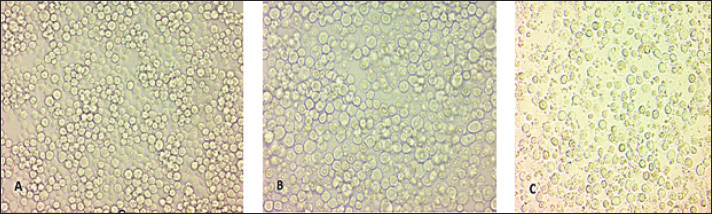 Fig. 3. Development of CPE in Sf9-infected cells under an inverted microscope (10X). (A) Cell control. (B) Early phase CPE. (C) Late phase CPE. Characterization of the expressed recombinant HA proteinFunctional analysisTo express the HA protein, insect cells were infected with a high-titer virus stock. Several factors that influence the expression conditions were tested and optimized including cell line, culture media, MOI, and time of protein harvesting. The expressed protein was characterized for its functional activity (i.e., hemagglutination) using both HAD and plate hemagglutination assays. HAD was performed on Sf9 cells infected by different dilutions of the recombinant baculovirus (108 to 106 pfu/ml). Clumps of chicken RBCs surrounding Sf-9 cells were evident in the entire monolayer sheet of cells in all dilutions compared to control noninfected cells (Fig. 4A). Similarly, proteins expressed in cell lysates were able to hemagglutinate chicken RBCs in solution (1%) as determined by plate hemagglutination test till the dilution of 5 × 107 pfu/ml (Fig. 4B).