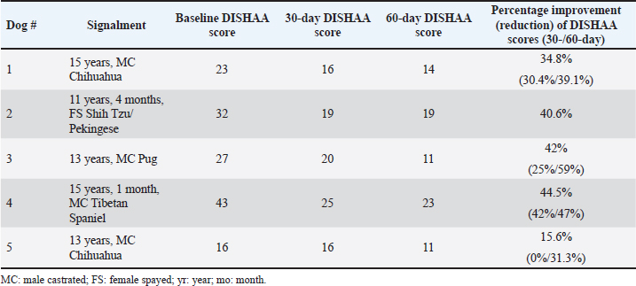 Fig. 2. DISHAA scores in five dogs treated with tPBMT. Scores at 30 and 60 days differed from day 0; scores at 60 days differed from scores at 30 days. The ideal tPBMT treatment protocol for CCD-if one exists-remains unknown. We based our protocol on limited information from rodent AD models and human AD clinical trials (Gonzalez-Lima and Barrett, 2014; Salehpour et al., 2017; Enengl et al., 2020). Although we suspect that twice-a-week treatment may be sufficient, there may be more effective dosing regimens than what we used for our small clinical trial. Since PBMT is considered to have cumulative biological effects (Riegel and Godbold, 2017), it is possible that the initial month of therapy (three treatments per week) served as an induction phase, allowing for twice-a-week therapy in the second month to remain effective. Hopefully, further clinical research into various tPBMT protocols for CCD will help to better establish the most effective protocols for dogs affected by CCD. AcknowledgmentsThe authors wish to thank Multi Radiance Medical for providing the lasers for the study. Conflict of interestThere are no conflicts of interest associated with this investigation. FundingThis study was partially funded by Global Pet Project, INC, a 501c3 non-profit foundation. Authors’ contributionsDr. Dewey was responsible for the study’s inception, case recruitment, study design, and manuscript preparation. Dr. Rishniw conducted data analysis and edited the manuscript. Dr. Gerardi and Dr. Brunke were involved in case recruitment and manuscript editing. Ms. Sakovitch was responsible for client communication, data collection, and manuscript editing. Data availabilityAll data from this investigation are available upon request. ReferencesAilioaie, L.M., Ailioaie, C. and Litscher, G. 2023. Photobiomodulation in Alzheimer’s disease-a complementary method to state-of-the-art pharmaceutical formulations and nanomedicine? Pharmaceutics 15(3), 916. Anders, J.J., Ketz, A.K. and Wu, X. 2017. Basic principles of photobiomodulation and its effects at the cellular, tissue, and system levels. In Laser therapy in veterinary medicine: photobiomodulation. Eds., Reigel, R.J. and Godbold, J.C., Ames, IA: Wiley, pp: 36–51. Barrett, D.W. and Gonzalez-Lima, F. 2013. Transcranial infrared laser stimulation produces beneficial cognitive and emotional effects in humans. Neuroscience 230, 13–23. Chan, A.S., Lee, T.K., Yeung, M.K. and Hamblin, M.R. 2019. Photobiomodulation improves the frontal cognitive function of older adults. Int. J. Geriatr. Psychiatry. 34, 369–377. Chapagain, D., Range, F., Huber, L. and Virányi, Z. 2018. Cognitive aging in dogs. Gerontology 64(2), 165–171. Dewey, C.W., Davies, E.S., Xie, H. and Wakshlag, J.J. 2019. Canine cognitive dysfunction: pathophysiology, diagnosis, and treatment. Vet. Clin. Small Anim. Pract. 49, 477–499. Dewey, C.W., Rishniw, M., Johnson, P.J., Platt, S., Robinson, K., Sackman, J. and O’Donnell, M.O. 2020. Canine cognitive dysfunction patients have reduced total hippocampal volume compared with aging control dogs: a comparative magnetic resonance imaging study. Open Vet. J. 10, 438–442. Dewey, C.W., Brunke, M.W. and Sakovitch, K. 2022. Transcranial photobiomodulation (laser) therapy for cognitive impairment: a review of molecular mechanisms and potential application to canine cognitive dysfunction (CCD). Open Vet. J. 12, 256–263. Enengl, J., Hamblin, M.R. and Dungel, P. 2020. Photobiomodulation for Alzheimer’s disease: translating basic research to clinical application. J. Alzheim. Dis. 75, 1073–1082. Gonzalez-Lima, F. and Barrett, D.W. 2014. Augmentation of cognitive brain functions with transcranial lasers. Front. Syst. Neurosci. 8, 36. Gonzalez-Martinez, A., Rosado, B., Pesini, P., Garcia-Belenguer, S., Palacio, J., Villegas, A., Suarez, M.L., Santamarina, G. and Sarasa, M. 2013. Effect of age and severity of cognitive dysfunction on two simple tasks in pet dogs. Vet. J. 198(1), 176–181. Hamblin, M.R. 2016. Shining light on the head: photobiomodulation for brain disorders. BBA Clin. 6, 113–124. Hamblin, M.R. 2019. Photobiomodulation for Alzheimer’s disease: Has the light dawned? Photonics 6(3), 77. Hennessy, M. and Hamblin, M.R. 2017. Photobiomodulation and the brain: a new paradigm. J. Opt. 19(1), 013003. Landsberg, G.M., Nichol, J. and Araujo, J.A. 2012. Cognitive dysfunction syndrome: a disease of canine and feline brain aging. Vet. Clin. Small Anim. 42, 749–768. Lapchak, P.A. 2012. Transcranial near-infrared laser therapy applied to promote clinical recovery in acute and chronic neurodegenerative diseases. Expert. Rev. Med. Devices. 9, 71–83. Mintzopoulos, D., Gillis, T.E., Tedford, C.E. and Kaufman, M.J. 2017. Effects of near-infrared light on cerebral bioenergetics measured with phosphorous magnetic resonance spectroscopy. Photomed. Laser Surg. 35, 395–400. Naeser, M.A., Zafonte, R., Krengel, M.H., Martin, P.I., Frazier, J., Hamblin, M.R., Knight, J.A., Meehan, W.P. and Baker, E.H. 2014. Significant improvements in cognitive performance post-transcranial, red/near-infrared light-emitting diode treatments in chronic, mild traumatic brain injury: open-protocol study. J. Neurotrauma. 31, 1008–1017. Pan, Y., Landsberg, G., Mougeot, I., Kelly, S., Xu, H., Bhatnagar, S., Gardner, C.L. and Milgram, N.W. 2018. Efficacy of a therapeutic diet on dogs with signs of cognitive dysfunction syndrome (CDS): a prospective double blinded placebo controlled clinical study. Front. Nutr. 12(5), 1–10. Riegel, R.J. and Godbold, J.C. 2017. Fundamental information. In Laser therapy in veterinary medicine: photobiomodulation. Eds., Reigel, R.J. and Godbold, J.C., Ames, IA: Wiley, pp: 9–18. Salehpour, F., Ahmadian, N., Rasta, S.H., Farhoudi, M., Karimi, P. and Sadigh-Eteghad, S. 2017. Transcranial low-level laser therapy improves brain mitochondrial function and cognitive impairment in D-galactose-induced aging mice. Neurobiol. Aging. 58, 140–150. Sa