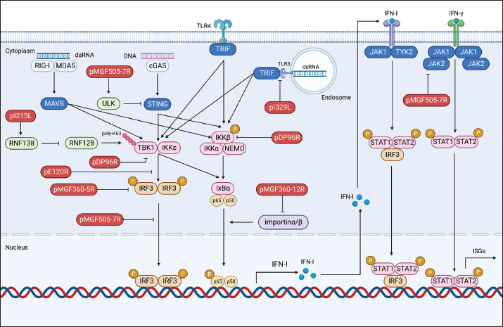 Fig. 2. Regulation of IFN production by ASFV proteins. The ASFV OURT88/3 variant, lacking specific genes from MGF360 or MGF505, has demonstrated heightened induction of IFN-I compared to its parent strain. This indicates the involvement of MGF360 and MGF505 members in regulating IFN expression (O’Donnell et al., 2015; Golding et al., 2016). Beyond IFN expression regulation, certain ASFV MGF family members directly influence IFN production. For instance, A276R, a MGF360 member, impedes IFN-β induction in an IRF3-dependent manner, with the underlying mechanism warranting further investigation (Correia et al., 2013). Similarly, MGF360-12L significantly hinders poly (I:C)-induced activation of the host immune response by disrupting the importin α-NF-κB interaction and inhibiting p65 nuclear translocation, resulting in diminished host antiviral response activation (Zhuo et al., 2021). Within the ASFV multigene family, the early-expressed MGF505-7R emerges as a crucial regulator of the cGAS-STING pathway. Research indicates that an ASFV strain lacking MGF505-7R prompts elevated levels of type I IFN and exhibits diminished virulence in piglets compared to the wild-type ASFV. MGF505-7R’s modulation of the cGAS-STING pathway involves its interaction with STING, resulting in reduced STING expression through heightened ULK1, an autophagy-related protein. In addition, MGF505-7R hinders the nuclear translocation of IRF3 and NF-κB by interacting with IRF3 and IKKα, ultimately leading to decreased production of IFN-β and proinflammatory cytokines (Yang et al., 2022a). MGF505-11R, an MGF family member, impedes cGAS-STING-driven immune responses by selectively interacting with STING. It promotes STING degradation through diverse pathways, including lysosomal, ubiquitin-proteasome, and autophagy routes (Yang et al., 2021a). In addition, MGF360-11L forms associations with TBK1 and IRF7 to hinder IFN-I production. Subsequently, TBK1 and IRF7 undergo degradation via the cysteine, ubiquitin-proteasome, and autophagy pathways (Yang et al., 2022b; Orosco and Espiritu, 2024). Furthermore, MGF360-14L inhibits type I IFN production by binding to the E3 ubiquitin ligase TRIM21. This interaction facilitates K63-linked ubiquitination of IRF3, destabilizing IRF3, and suppressing type I IFN production (Wang et al., 2022). In a recent investigation, it was disclosed that ASFV MGF360-9L functions as a suppressive regulator of IFN-β signaling. Precisely, MGF360-9L induces the decay of signal transducer and activator of transcription (STAT) 1 via apoptotic pathways and STAT2 through the ubiquitin-proteasome pathway. These revelations shed light on how ASFV eludes host antiviral responses and could potentially guide the creation of live attenuated ASFV vaccines (Zhang et al., 2022). pI329LASFV’s pI329L, a late protein encompassing 329 amino acids, exhibits a noteworthy degree of conservation. Intriguingly, aligning the pI329L sequence with TLR proteins unveils a 35% similarity between the intracellular domain of pI329L and the BOX1 and BOX2 regions within the human Toll-interleukin-1 receptor-like domain of TLR3 (de Oliveira et al., 2011). Prior research indicates that the ASFV protein pI329L functions as a viral antagonist to TLR3, hindering the activation of IFN-I by dsRNA or LPS. Structural analysis suggests pI329L targets TRIF, an adaptor protein in the TLR3 pathway. Overexpressing TRIF eliminates pI329L’s impact on IRF3 and NF-κB activation and IFN expression (Henriques et al., 2011; de Oliveira et al., 2011). In addition, the attenuated ASFV OURT88/3 strain, lacking I329L, induces heightened IFN-I expression in infected macrophages compared to its parent virus. However, it demonstrates reduced protection against challenges with the virulent ASFV OURT88/1 strain in pigs. Intriguingly, I329L deletion does not attenuate the ASFV Georgia 2007/1 strain (Reis et al., 2020). pDP96RpDP96R, an early expressed protein of ASFV, is encoded in the genome’s right variable region, with a molecular weight of around 10.7 kDa (Zsak et al., 1998). Recent research demonstrates that removing double genes 9GL (B119L) and UK (DP96R) in the Georgia 2007/1 mutant (ASFV-G-Δ9GL/ΔUK) significantly diminishes virus replication and pathogenicity in domestic pigs (O’Donnell et al., 2017; Orosco, 2023c). In addition, pDP96R has been identified as a negative regulator of IFN-I production via the cGAS-STING signaling pathway and influences NF-κB signaling by obstructing TBK1 and IKKβ activation (Wang et al., 2018). This underscores the crucial role of pDP96R in ASFV immune evasion. pE120RpE120R, a highly conserved capsid constituent of ASFV, links with the principal capsid protein p72 and encompasses about 120 amino acids (Liu et al., 2021). Recent investigations unveil pE120R’s pivotal role in inhibiting cGAS-STING-mediated immune response. It achieves this by binding to the C-terminal domain of IRF3, hindering IRF3 phosphorylation and impeding its recruitment to TBK1. This ultimately results in diminished IFN production (Liu et al., 2021; He et al., 2022). In addition, the inhibitory effect of pE120R relies on specific amino acids at positions 72 and 73. Deleting these residues annuls the IRF3-pE120R interaction, amplifies IFN-β and various ISG expressions, and suppresses ASFV replication in porcine alveolar macrophages (Liu et al., 2021). pI215LpI215L stands as the sole E2-ubiquitin conjugating enzyme of ASFV. Its conserved N-terminal region exhibits 31%–45% identity and 52%–66% similarity with other ubiquitin-conjugating enzymes (UBC) (Hingamp et al., 1992; Orosco, 2023d). Recent studies affirm pI215L as a potent inhibitor of IFN-I. Silencing pI215L hampers ASFV HLJ/18 strain replication while elevating IFN-β production. Further analysis reveals that pI215L curtails K63-linked polyubiquitination of TBK1, a pivotal post-translational modification for TBK1 activation, consequently impeding IFN-β production (Huang et 