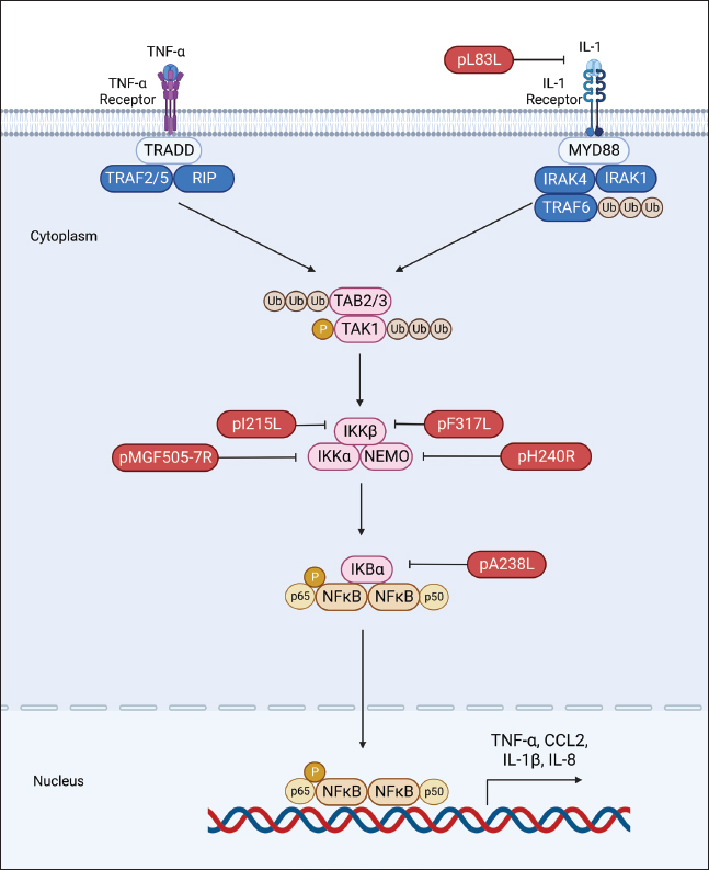 Fig. 3. Regulation of inflammatory responses by ASFV proteins. Evidence indicates that pA238L engages with the catalytic subunit of the serine-threonine protein phosphatase calcineurin (CaN) to regulate its phosphatase activity (Miskin et al., 2000). CaN plays a pivotal role in various pathways, including the activation of NFAT family transcription factors that stimulate cytokine production, such as IL-2, IL-4, and GM-CSF (Hogan, 2017). Through its interaction with CaN, pA238L obstructs NFAT activation by modulating its phosphatase activity (Miskin et al., 2000). In addition, pA238L has been demonstrated to repress COX-2 transcription, a potent lipid mediator of inflammation, in an NFAT-dependent manner (Granja et al., 2004). pMGF505-7RIL-1β, a versatile proinflammatory cytokine with diverse effects, is primarily synthesized by monocytes, macrophages, and lymphocytes, playing a pivotal role in regulating innate and adaptive immune responses (Aarreberg et al., 2018). Within ASFV-encoded proteins, pMGF505-7R emerges as a potent inhibitor of inducer-mediated IL-1β production. Research indicates that pMGF505-7R interacts with IKKα, impeding IκBα phosphorylation, and NF-κB nuclear translocation, and subsequently diminishing pro-IL-1β transcription. In addition, pMGF505-7R engages with NLRP3, hindering NLRP3 inflammasome assembly and thus suppressing mature IL-1β secretion. Importantly, the removal of MGF505-7R from the ASFV HLJ/18 strain is associated with attenuated ASFV virulence and heightened IL-1β production in vivo compared to its parental ASFV strain (Li et al., 2021b). pL83LThe L83L gene encodes pL83L, a protein highly conserved across ASFV strains and anticipated to undergo prenylation (Marakasova et al., 2017). Positioned near the left end of the ASFV genome, pL83L, an early-expressed protein, exhibited binding to IL-1β in a yeast two-hybrid assay. Although lacking in vivo evidence regarding its impact on IL-1β activity, there is speculation about pL83L potentially influencing this proinflammatory cytokine. Notably, studies involving the deletion of the L83L gene observed no reduction in virus replication in macrophages or a decrease in virulence in domestic pigs (Borca et al., 2018). Comprehensive investigations are required to unveil the precise functional role of pL83L. pF317LpF317L protein is a novel, poorly characterized protein of ASFV, consisting of 317 amino acids with an unknown function (Dixon et al., 2013). Recent studies have revealed that pF317L interacts with IKKβ and negatively regulates its activation. This leads to the stabilization of IκBα and inhibition of NF-κB activation, thereby reducing the expression of various proinflammatory cytokines and facilitating viral replication (Yang et al., 2021b; Mahedi et al., 2023). It has been demonstrated that deletion of F317L is lethal to ASFV, while ectopic expression of pF317L can enhance ASFV replication efficiency in porcine alveolar macrophages (iPAMs) (Yang et al., 2021b). However, whether the knockdown of F317L affects the inflammatory response has yet to be confirmed. pS273RpS273R, expressed in the late phases of ASFV infection, is situated within the cytoplasmic viral factories. This 273-amino acid protein, identified as a cysteine proteinase in the SUMO-1-specific protease family, has been studied extensively (Andrés et al., 2001). Recent investigations underscore the pivotal role of pS273R in modulating the host’s inflammatory reactions by impeding ASFV-induced pyroptosis (Zhao et al., 2022), a programmed cell death crucial for eliminating pathogens and instigating inflammatory responses to enhance protective host immunity (Kesavardhana et al., 2020). pS273R engages with GSDMD and cleaves it at G107–A108, generating a truncated N-terminal fragment, GSDMD-N1–107. Unlike the conventional GSDMD-N1–279 induced by caspase-1, GSDMD-N1–107 lacks the capacity to induce pyroptosis. In addition, pS273R further processes GSDMD-N1-279 into GSDMD-N1-107, which, in turn, hinders GSDMD-N1-279-triggered pyroptosis and facilitates ASFV replication (Zhao et al., 2022). pH240RASFV pH240R serves as a robust suppressor of IL-1β transcription, maturation, and secretion, along with restraining NLRP3 inflammasome activation in inflammatory responses (Huang et al., 2023). Its inhibitory actions extend beyond NF-κB signaling to encompass NLRP3 inflammasome activation. In this process, pH240R interacts with NF-κB essential modulator (NEMO), a component of the inhibitor of kappa B kinase (IKK) complex, leading to diminished phosphorylation of IκBα and p65. Moreover, pH240R binds to NLRP3, impeding NLRP3 inflammasome activation and subsequently reducing IL-1β production. Noteworthy is the observation that the removal of the H240R gene amplifies antiviral inflammatory responses, evident through heightened inflammatory cytokine expression both in vitro and in vivo, ultimately mitigating viral pathogenicity in pigs compared to its parental strain. These findings underscore the pivotal role of pH240R in ASFV virulence, indicating its potential as a subject for in-depth exploration into ASFV immune evasion mechanisms. Such investigations may pave the way for the development of attenuated live vaccines and therapeutic interventions for effective ASF prevention and control (Huang et al., 2023). Regulation of apoptosisApoptosis, a programmed cell death mechanism vital for maintaining normal tissue homeostasis in multicellular organisms, serves as a significant host defense against virus infections, curbing virus replication and clearing infected cells (D’Arcy, 2019; Simbulan et al., 2024). Given its pivotal role, it is unsurprising that numerous viruses employ diverse strategies to impede or prolong apoptosis, ensuring their survival and replication (D’Arcy, 2019; Fan, 2019). A distinctive characteristic of acute ASF is the initiation of apoptosis in infected macrophages in vivo, as evidenced by earlier investigati