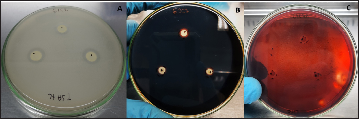 Fig. 1. Extracellular enzymatic activity of selected isolates. A) Isolate G1C2 exhibiting the highest protease activity, B) Isolate G3C7 displaying amylase activity, and C) Isolate G4C7A with negative cellulase activity. Table 3. Growth measured in OD650 of microbial isolates in MRS broth at pH 5.0 and 4.01 normalized with respect to growth at pH 6.5.