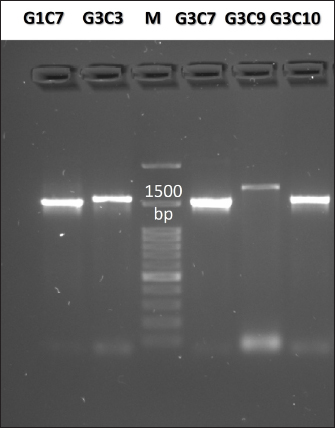 Fig. 4. Agarose gel electrophoresis of PCR products targeting the 16S rRNA gene amplified from the genomic DNA of G1C7, G3C3, G3C7, G3C9, and G3C10. M is a 100 bp molecular weight marker. DiscussionThis investigation focused on the isolation of microorganisms from guinea pig feces, leveraging the transit of fecal pellets through the colon to capture microorganisms from the internal intestinal walls. The utilization of a selective MRS medium for bacterial isolation favored the growth of lactic acid bacteria, contributing to the observed prevalence of Gram-positive bacteria. Furthermore, the coexistence of both Gram-positive and Gram-negative bacteria aligns with the established distribution of predominant phyla in the guinea pig intestine. Specifically, Firmicutes encompasses a substantial population of Gram-positive bacteria, while Bacteroidetes comprises Gram-negative bacterial entities (Crowley et al., 2017). As evidenced by the results, equivalent levels of cocci and bacilli were discerned, accompanied by an increased prevalence of catalase-positive bacteria. This observation diverges from the findings of Serrano et al. (2020), who documented a prevalence of bacillary strains isolated from guinea pig feces, with over 80% of bacteria exhibiting catalase negativity. The criteria for the selection of potential probiotic microorganisms encompassed attributes such as lactic acid bacteria, Gram-positive staining, and catalase negativity (Jung et al., 2020; Castillo et al., 2022). Protease activity emerges as a noteworthy characteristic among probiotic microorganisms, contributing to the generation of bioactive peptides endowed with antimicrobial, immunomodulatory, and antioxidant properties conducive to host well-being (Wang et al., 2021). Notably, all assessed bacteria manifested proteolytic activity, aligning with the findings of Serrano et al. (2020), who identified a substantial proportion of lactic acid bacteria isolated from guinea pig feces exhibiting protease activity, with a heightened prevalence in the Peruvian breed in comparison to the Andean or Inti breed. Furthermore, the levels of proteolysis closely paralleled those observed in probiotics isolated from other species, such as cattle, where indices of proteolytic activity were analogous (0.2–0.6) (Ramadhan et al., 2021). Conversely, an inquiry into probiotics isolated from pig feces revealed proteolytic halos with a maximum diameter of 3 mm following 24 hours of incubation (Marchwińska and Gwiazdowska, 2022). Another investigation focused on probiotics obtained from sheep dairy products reported protein hydrolysis diameters exceeding 10 mm (Silva et al., 2019). The microbial capacity for carbohydrate hydrolysis through the enzymatic actions of amylase and cellulase plays a pivotal role in enhancing food digestibility and optimizing the utilization of the provided diet (Yi et al., 2020). The observed low incidence of bacteria exhibiting amylolytic capacity in this study aligns with previous investigations, revealing only 13% of amylolytic strains isolated from porcine intestines (Marchwińska and Gwiazdowska, 2022), and a mere 8% of strains with recognized probiotic potential isolated from guinea pig feces (Serrano et al., 2020). Notably, the amylolytic levels recorded fall within the spectrum of those reported for amylolytic isolates originating from the intestines of Osphronemus goramy fish (Suprayudi et al., 2016). Table 5. Accession numbers and strain names stored in GenBank with the highest percentage of identity to potential probiotic isolates.