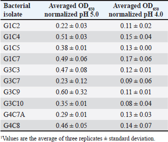 Fig. 2. Bar chart illustrating the tolerance of bacterial isolates to pH 5.0 and 4.0 expressed in OD values at 650 nm normalized with respect to growth at pH 6.5. (*) indicates significant differences.