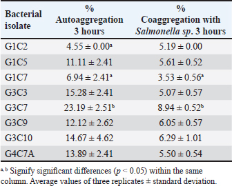 where Abs3 hours represents the absorbance at 650 nm after 3 hours of incubation, and Abs0h represents the absorbance at 650 nm at the start of incubation (0 hour) (Tuo et al., 2013). Co-aggregation assayThe selected bacteria were cultured in MRS broth and incubated at 37°C under microaerophilic conditions for 20 hours. In addition, an aliquot of Salmonella sp. was cultured in TSB broth (Difco, USA) and incubated at 37°C for 20 hours. Suspensions of lactic acid bacteria and Salmonella sp. were prepared in PBS 1× as described in the auto-aggregation assay, considering an OD650 of 0.29 ± 0.05 for Salmonella sp. Subsequently, 1 ml of the suspension of each evaluated bacterium was mixed with 1 ml of Salmonella sp. suspended in PBS 1×. The mixture underwent vortex agitation and was incubated at 37°C for 3 hours. The absorbance was then measured at 650 nm. The percentage of co-aggregation was calculated as follows: