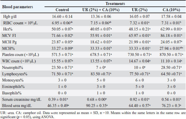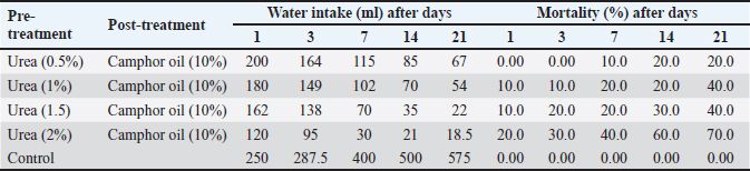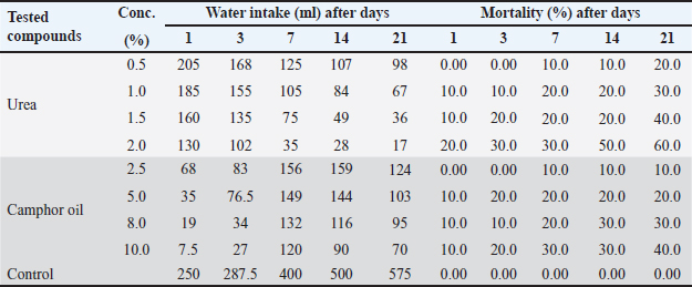 Effect of the pre-treatment with urea and camphor oil post-treatment against R. norvegicus ratsThe effect of camphor oil at the highest concentration 10% post-treatment after the pre-treatment with urea at the concentrations (0.5%, 1%, 1.5%, and 2%) separately was illustrated in Table 2. The obtained results showed that the highest water intake at all tested treatments was recorded on the first day of the experiment. Whereas, with an increase in the experimental time and an increase in the concentration of urea in the pre-treatment before camphor oil post-treatment, the water administered by rats was decreased. Thus, the highest concentration of urea 2% pre-treatment before camphor oil post-treatment caused the lowest intake of water (18.5 ml) at the end of the experiment on day 21. Water consumption rates for all tested treatments were below that of untreated rats in control. Furthermore, increasing the concentration of urea in the pre-treatment before the treatment with camphor oil led to an increase in the mortality of rats. The highest mortality value 70% was achieved by urea at the highest concentration of 2% pre-treatment followed by camphor oil post-treatment after 21 days of the experiment. The lowest concentration of 0.5% of urea followed by camphor oil as post-treatment markedly reduced the mortality of rats to 20% after the same experimental time. In contrast, there is no mortality of untreated rats was recorded in the control. It seems clear from our results that increasing the urea concentration in the pre-treatment induced an observed reduction in the water intake by rats and increased at the same time mortality rate. Table 2. Effect of the pre-treatment with urea and camphor oil post-treatment against Rattus norvegicus rats.