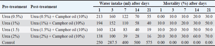 Effect of urea and camphor oil against R. norvegicus ratsIn our study, with an increase in the concentration of urea in the pre-treatment before the post-treatment with camphor oil, the water administered by rats decreased and the mortality rate increased. Consequently, the highest concentration of urea (2% pre-treatment) before the post-treatment with camphor oil at a concentration of 10% caused the lowest water intake (18.5 ml) and the highest rate of mortality (70%) at the last experiment on day 21. Furthermore, increasing the urea concentration in the pre-treatment of rats and also in the post-treatment when mixed with camphor oil led clearly to an increase in the mortality rate of rats. These findings were in agreement with a related earlier study that showed that the efficacy of the post-treatment depends mainly on the substance used in the pre-treatment and the dosage of the other substance used in the post-treatment (Inns and Leadbeater, 1983). Similar findings revealed that in the post-treatment of rats with K-27 after the pre-exposure to paraoxon, the survival of treated animals depends on the substance used in the pre-treatment and also on the dose of paraoxon. Additional administration of K-27 after the pre-treatment with paraoxon caused a considerable rise in the mortality of wild rats compared to those exposed to paraoxon alone. Moreover, the pre-treatment with physostigmine or K-27 before the treatment with the sublethal dose of paraoxon caused an increase in the mortality rate of rats (Dietrich et al., 2020). On the contrary, Nurulain et al. (2009) reported that sometimes the post-treatment reduces the toxic influence of the pre-treatment against rats and thus reduces the mortality rate. The post-treatment of male Wistar rats orally with Vernonia amygdalina extract after the pre-administration of dimethyl nitrosamine significantly reduced the toxic effect of dimethyl nitrosamine (Usunobun and Anyanwu, 2016). In addition, Fanucchi et al. (2012) indicated that the pre-exposure of Sprague–Dawley adult rats to chlorine caused severe injury to the airway and pulmonary edema, which led to mortality. The post-treatment of rats with a mixture of ascorbate and deferoxamine after the pre-exposure to chlorine can reduce the severity of acute lung injury induced by chlorine and so decrease mortality. In the same trend, Annateresa et al. (2013) demonstrated that the combination of canola oil with Nacl enhances the oxidative stress of spontaneously hypertensive stroke prone (SHRSP) rats. However, the amount of water intake by rats treated with canola oil combined with salt was significantly higher than that taken by rats administered with canola oil alone.