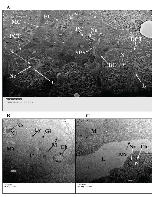 Fig. 1. Electron micrograph of the kidney cortex components of a normal wild rat indicating Malpighian corpuscle which explains the general morphology of glomerular capillary and podocyte. The podocyte cell body (Pc) has an irregular-shaped nucleus (N) with batches of chromatine materials (Ch), centrally placed in the cytoplasm packed with various inclusions and organelles, and peripheral nucleolus (Ne). The glomerular capillary has filtration slit (FS), primary process (PP), secondary foot processes (SPs), subpodocyte space (SPS), blood capillary (BC), and red blood cells (RBCs) (X 1500) (A). The general morphology of proximal convoluted tubule (PCT) which has round nuclei (N) with peripherally located nucleoli (Ne) and homogenously distributed chromatine (Ch), peripherally placed in a cytoplasm packed with different inclusions and organelles, long microvilli (Mv), and central small lumen (L). These organelles comprise lysosomes (Ly) appear as small rounded vesicles bounded by a single membrane, mitochondria (M) which are numerous exhibiting elongated or round shapes, and abundant glycogen particles (Gl) in the form of rosette-shaped particles (X 4000) (B). The distal convoluted tubule has basal infoldings (IFs), short microvilli (Mv), central large lumen (L), and the same inclusions of PCT (X4000) (C). Physico-chemical parameters of the waterAs is clear in the results, there is no change in the color and odor of the water samples except for the mixing of urea (2%) with camphor oil (10%) and camphor oil (10%) only due to the addition of the camphor oil (Gupta, 2000). The present investigation indicated that the pH values of different treatments were alkaline, and additional impacts of urea to camphor oil were found. This is in agreement with that of Davies (2005) and Meloni and Oy (2013). The results of this study showed that pH values at different examined limits lie within the favorable levels (6.2–8.3) recommended for the survival and growth of living creatures except for the mixture of urea with camphor oil, and this complies with the results of Korai et al. (2008) and Pandey and Tiwari (2009).