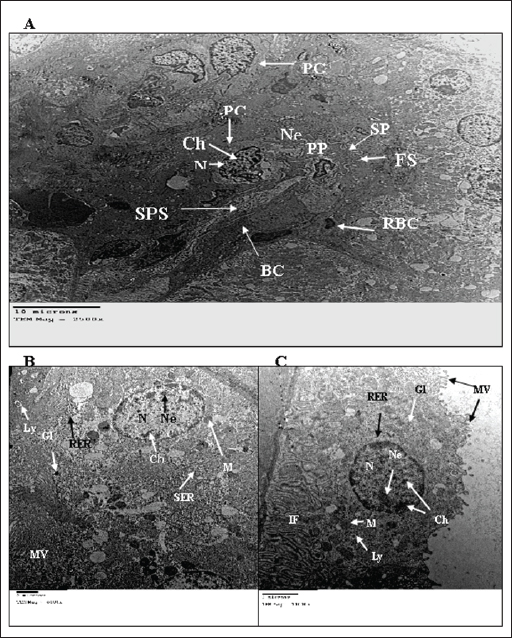 Fig. 2. TEM micrograph of the kidney cortex components of a normal wild rat indicating the general morphology of Malpighian corpuscle showing the general morphology of glomerular capillary and podocyte. The Pc has an irregular-shaped nucleus (N) with batches of chromatin materials (Ch), centrally placed in a cytoplasm packed with different inclusions and organelles, and peripheral nucleolus (Ne). Glomerular capillary has FS, PP, SPS, SP, BC, and RBC (X 2500) (A). PCT has a round nucleus (N) with homogenous distributed chromatine (Ch), peripherally placed in a cytoplasm packed with different inclusions and organelles, and peripherally located nucleolus (Ne), and long microvilli (Mv). These organelles consist of smooth endoplasmic reticulum (SER) and rough endoplasmic reticulum (RER). Lysosomes (Ly) appear as small rounded vesicles bounded by a single membrane. Abundant glycogen particles (Gl) in the form of rosette-shaped particles. Mitochondria (M) are numerous showing elongated or round shapes. (X 6000) (B). The distal convoluted tubule cell has basal IF, short microvilli (Mv), and the same inclusions of PCT (X10000) (C).