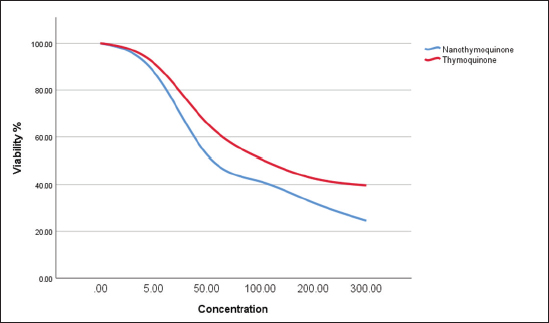 Fig. 1. The effect of different concentrations of thymoquinone (red line) and MaSCs-Exo (blue line) on viability of MCF-7 cell line.
